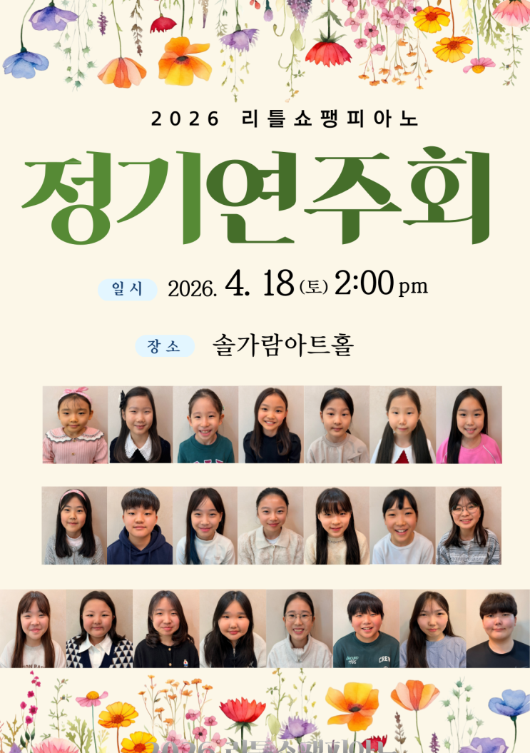 안녕하세요, 리틀쇼팽피아노 김지연원장입니다 올해도 저희 리틀쇼팽 친구들이 1년 동안 갈고닦은 실력을 마음껏 보여드릴 정기연주회 소식을 전해드리게 되었어요. 무대 위에서 반짝이는 아이들의 모습을 상상하면 벌써부터 마음이 두근두근합니다✨ 2026 리틀쇼팽피아노 정기연주회 일시: 2026년 4월 18일(토) 오후 2시 장소: 솔가람아트홀 매년 봄이 되면 찾아오는 리틀쇼팽의 정기연주회는 학생들이 1년간 성장한 모습을 가장 빛나게 보여주는 소중한 자리예요. 처음 피아노를 배우기 시작한 친구부터, 이제는 음악을 통해 자신만의 이야기를 표현하는 친구들까지— 모두가 진심을 담아 준비하고 있습니다 이번 무대....... <img src="https://blogthumb.pstatic.net/MjAyNjAzMjVfMTU4/MDAxNzc0NDE5MzE0NTc5.YnDxJtmP6GBIlhfwKy09A9hdo8UrrmlZb0xFTVZEA3Ag.YHCUBfjX_ztpaA82g-OLfCwqmNvewYnVTZIxWzfCeV4g.PNG/KakaoTalk_Photo_2026-03-25-15-12-53.png?type=s3" />