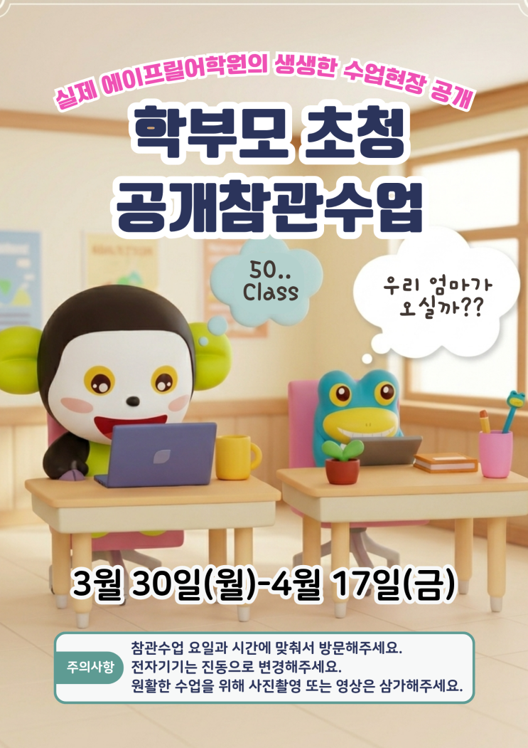 안녕하세요. 이챕터스주엽영어도서관학원 입니다. 4월 2일부터 출결시스템 변동에 대해 안내드립니다. 기존 등/하원 알람 문자 시스템에서 -> 카카오톡 알람톡 형식으로 바뀌게 됩니다. 아래 사진은 Regular 90분 테스트 사진입니다. 실시간 등원시간은 물론, 현재 수업회차와 수업 기간, 하원예상시간 까지 안내를 해줘서 앞으로 더욱 편리하게 확인을 하실 수 있습니다. 또한, 학생들이 간혹 다른 학생 파일카드로 출결을 하는 경우도 가끔 있었는데요. 앞으로, 카드 대신 태블릿으로 학생마다 고유의 출결번호를 눌러 등/하원 하는 시스템으로 바뀌게 됩니다. 이와 더불어, 원생관리 프로그램 변경예정으로 모든 원생기록을 옮기는 수작업....... <img src="https://blogthumb.pstatic.net/MjAyNjAzMjBfMTIy/MDAxNzc0MDExNDA3NTg2.n8e1LZSNtqOqORoFECkbC_rNCZSkIO4sX3sWvXXPqbwg.7BG_PgBXIzV9wkyU4iTW5Fip94EoZj1yhNqraOhorBsg.PNG/%BD%BA%C5%A9%B8%B0%BC%A6_2026-03-20_%BF%C0%C8%C4_9.56.45.png?type=s3" />