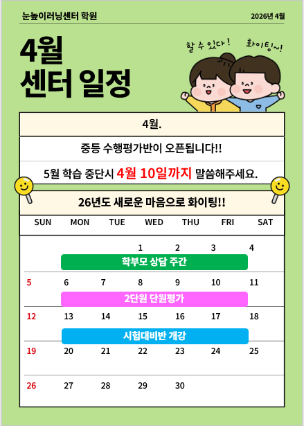 미미 음악학원의 시그니처 수업, 금요일 밋츠(Meets) 수업의 2026년 4월 계획표를 게시합니다. 미미음악학원에서는 연주 수업(Music)과 더불어 아이들이 음악을 조금 더 넓게 경험할 수 있는 시간을 중요하게 생각하고 있어요. 그래서 매주 금요일에는 정규 연주 수업과는 다른 성격의 밋츠(Meets) 수업을 진행하고 있습니다. 원생 대상으로 무료로 진행되며, 뮤직 수업 횟수에 포함되지 않는 수업입니다. 이번 달은 아이들이 악보의 체계를 이해하고, 직접 짧은 곡을 만들어보는 활동까지 이어질 예정이에요! 악보를 읽는 과정은 한글을 배우는 것처럼 새로운 ‘문자’를 익히는 과정입니다. 왼쪽에서 오른쪽으로 읽어가며 음을 이해하고 연주하....... <img src="https://blogthumb.pstatic.net/MjAyNjA0MDNfMTY1/MDAxNzc1MjAxODEzNDYw.Q_2GYNXc7qJVylzKa6uW0D3qdy-vyaP327U1RCQFtzgg.Ze5jJtsEIbC2B4vAo91xiIGErIt5F5gQFZ5oZKrknGIg.JPEG/2026%B3%E2_1%BF%F9_%283%29.jpg?type=s3" />