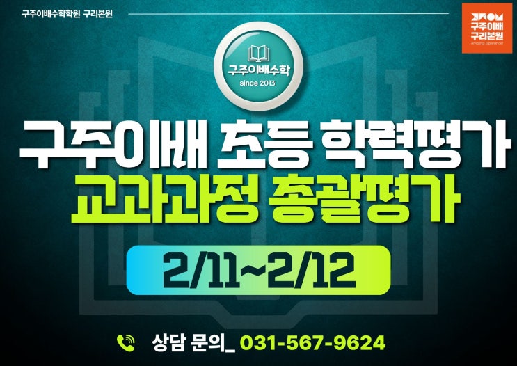 구리수학학원 구주이배 구리본원 GQE 초등현행 총괄평가 구주이배 구리본원 초6,5,4 재원생 [일시] 2월 11일(수)~12(목) 안녕하세요, 구리 구주이배수학학원입니다. 구리 구주이배수학학원에서는 초6, 초5, 초4, 초3 학생들을 대상으로 매 분기마다 현행과정에 대한 총괄평가를 진행하고 있습니다! ★분기마다 진행하는★ ☆구주이배 초6·5·4 현행과정 총괄평가☆ [응시대상] 구주이배 구리본원 초6,5,4 재원생 [출제범위] 각 학년 1학기 1~3단원 [시험시간] 60분 [시험문항] 20문항 (단답형 문제, 서술형 문제 포함) [시험결과] 시험 결과분석표 제공 구리 구주이배학원의 다양한 초등프로그램이 궁금하시다면 언제든지 상담문의 부탁드립니다! ....... <img src="https://blogthumb.pstatic.net/MjAyNjAxMjJfMTgx/MDAxNzY5MDYxMTk3MDIz.tuqYiJYIFcyHaRRbqsb6dqyTZP7VEkdpLH0gzWE4pLgg.aVaq6KIF59VR2lHnrLYoKPZJzvkJg3gHXdQl_Y_Hat8g.JPEG/%C1%A6%B8%F1%C0%BB_%C0%D4%B7%C2%C7%D8%C1%D6%BC%BC%BF%E4..jpg?type=s3" />