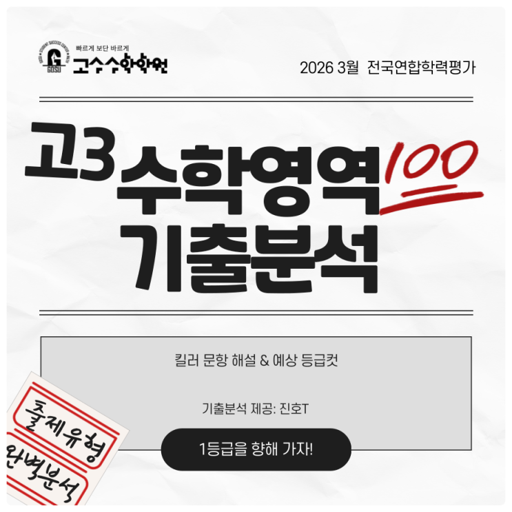 안녕하세요, 구리 고수수학학원입니다. 2026학년도 대입의 첫 관문인 3월 전국연합학력평가가 마무리되었습니다. 고3 수험생 여러분, 그리고 곁에서 지켜보신 학부모님들 모두 고생 많으셨습니다. 이번 시험은 겨울방학 학습의 중간 점검이자, 수능까지의 장기 로드맵을 수정해야 하는 중요한 지표입니다. 고수수학에서는 시험 직후 정진호 선생님께서 모든 문항을 직접 풀이하고 분석하여, 우리 학생들을 위한 실질적인 처방전을 준비했습니다. 2026 3월 학평 수학 영역 총평 "문제는 평이했으나, 체감 난도는 높았던 시험" 이번 시험은 지난해 수능 기조를 유지하며 급격한 난도 상승은 없었습니다. 하지만 준킬러 문항들의 계산량이....... <img src="https://blogthumb.pstatic.net/MjAyNjAzMjVfMTE4/MDAxNzc0NDM0NDA1ODY5.3ww550qD7pHscfGadkpgDr8EleaJYsQNt_2JgFKHpv4g.laxg4z_Oi4ySko2wy0KXGt3RBL4gcCNTs0kkm2AiCcog.PNG/%BC%F6%C5%C3-%B0%ED%B5%EE%BA%CE-%C6%F7%BD%BA%C6%C3-003.png?type=s3" />