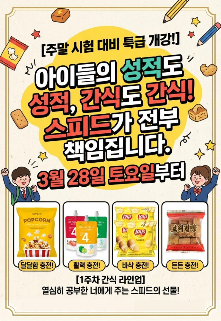 안녕하세요, 스피드TC학원입니다! 어느덧 봄바람이 불어오고, 새 학기 첫 시험이 다가왔습니다. 우리 아이들이 겨우내 갈고닦은 실력을 제대로 보여줄 시간이죠! 스피드는 이번 주 토요일, 3월 28일부터 본격적인 주말 시험 대비에 돌입합니다. 아이들을 맞이할 생각을 하니 벌써부터 설레고 기대가 됩니다! "성적은 확실하게, 간식은 든든하게!" 스피드는 우리 아이들의 빈틈없는 성적 관리뿐만 아니라, 지치지 않고 힘낼 수 있도록 맛있는 간식까지 책임지겠습니다. [1주차 간식 라인업 대공개] 단짠단짠의 정석! 곰곰 팝콘 (솔티드 카라멜 & 버터) 4kcal의 가벼운 행복! 네오 곤약 젤리 바삭바삭 멈출 수 없는 맛! 레이즈 감자....... <img src="https://blogthumb.pstatic.net/MjAyNjAzMjVfMTQg/MDAxNzc0NDMzMzc3NTM0.bPdfOC_dOdgJTxYia-pctVlm0ZjZCYT0tmK53_xgL0Eg.5PtOSodRm77ubUd1rb1Z3kAWxFvfkpNCHUixKaRfCOgg.PNG/image.png?type=s3" />