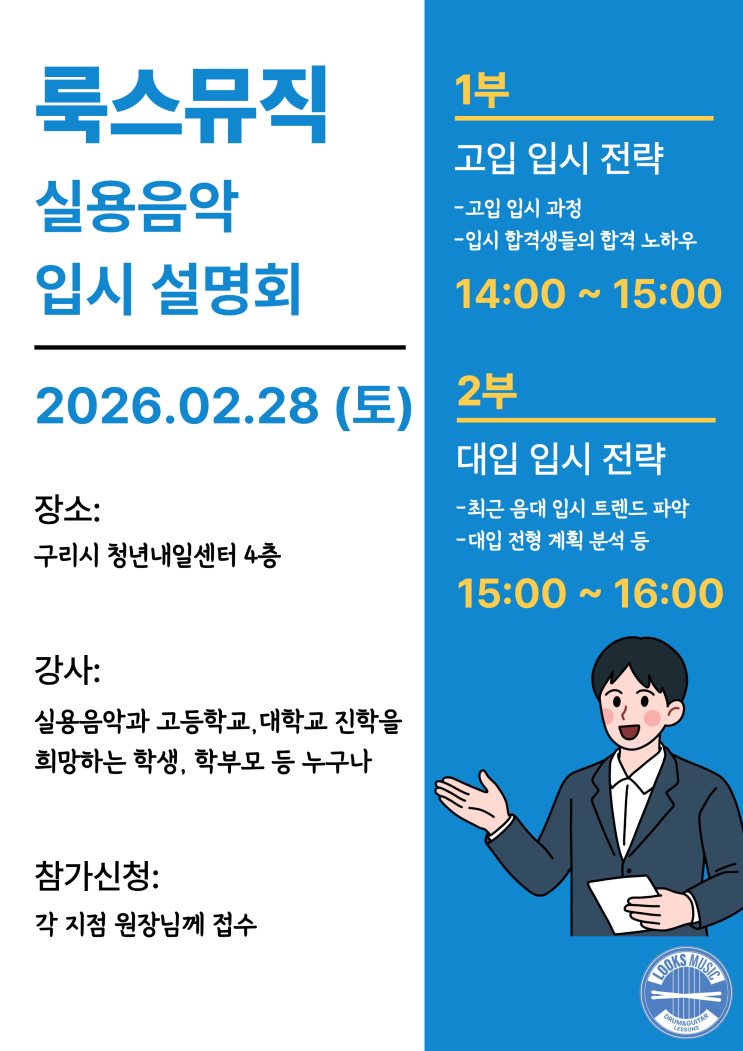 고입부터 대입까지. 처음부터 끝까지 세세하게 알려드립니다! 안녕하세요. 실용음악 진학을 고민하는 학생과 학부모님을 위해 룩스뮤직에서 입시설명회를 준비하게 되었습니다. 실용음악 입시설명회 꼭 필요한가? 실용음악과 입시는 다른 전공에 비해 정보를 접할 수 있는 창구가 많지 않고, 입시 구조 자체가 복잡하게 느껴지는 경우가 많습니다. 그래서 입시를 시작했음에도 지금 하고 있는 연습이 맞는 방향인지, 어떤 기준으로 계획을 세워야 하는지 등 막막함을 느끼는 분들도 적지 않습니다. 그래서 이번 입시 설명회는 입시를 고민중이거나 시작하신 분들에게 정말 필요한 길잡이라고 생각됩니다. 입시 설명회에서는 어떤걸 알려주나요? 이....... <img src="https://blogthumb.pstatic.net/MjAyNjAxMjhfMSAg/MDAxNzY5NjA3MDk5NTIy.xI65sWqHysgMQ-UwT29OODRi9Dcufdr7dJjevUifMZEg.4mwZvZU8PXnU5I07RUw6MQACvHDzOr6ahVHpg_SVBQMg.PNG/%C1%A6%B8%F1%C0%BB_%C0%D4%B7%C2%C7%D8%C1%D6%BC%BC%BF%E4._%286%29.png?type=s3" />