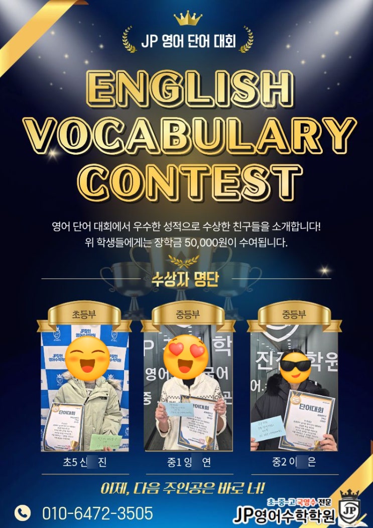 안녕하세요. 지금 필요한 우리들의 학원! jp학원입니다. 앞서 포스팅을 통해 안내드린 바와 같이, 영어 학습의 핵심은 어휘력이며 단어 이해가 곧 독해·문장력의 기초가 됩니다. 이에 따라 초·중·고등부를 대상으로 영어 단어 학습 성과를 점검하는 영어단어대회 평가를 실시하였는데요! 우리 아이들이 눈으로만 훑는 공부가 아니라, 진짜 자신의 실력을 점검하고 성취감을 맛볼 수 있도록 실시했던 [JP 영어 단어 평가 대회]! 그 결과와 함께 영광의 수상자를 소개합니다.:-) 우수한 성적으로 입상한 세 명의 주인공! 이 학생들에게는 노력에 대한 보상으로 상장과 장학금 50,000원이 수여되었습니다. 이번에 장학금을 받은 친구들에게는 '....... <img src="https://blogthumb.pstatic.net/MjAyNjAyMDJfMjI0/MDAxNzcwMDI1MjM3MTAx.HAqDLKkLy6CQUFom0WvTtck2IhEl_dS5UBCiHmjXS6gg.icKAJcTWki-Q7-IijdXTyLleocoCbfBzZCRpSfXCIg8g.JPEG/%C1%A6%B8%F1%C0%BB_%C0%D4%B7%C2%C7%D8%C1%D6%BC%BC%BF%E4._-_2026-02-02T183338.605.jpg?type=s3" />