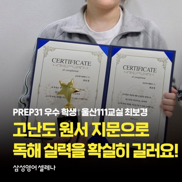 안녕하세요! 별내삼성영어학원 입니다- :) 오늘은 삼성영어셀레나의 최고 과정 PREP31을 수료한 울산광역시 북구 울산111교실 최보경 학생(중2)의 인터뷰를 소개합니다! 삼성영어셀레나를 선택한 이유는 무엇인가요? 초등학교 5학년 때 방과 후 영어 수업을 들었는데, 그때 저를 가르쳐 주시던 선생님께서 학원을 여신다고 하셔서 자연스럽게 학원을 다니게 됐어요. 삼성영어셀레나를 다니면서 가장 좋았던 점은 무엇인가요? 영어 독해 실력을 확실히 키울 수 있어서 좋았어요. PREP31을 공부하기 전과 후 달라진 점은 무엇인가요? 글에서 메인 아이디어를 찾는 연습을 하며 지문의 의도나 글의 흐름, 주제를 예전보다 훨씬 빠르게 파악할 수 있....... <img src="https://blogthumb.pstatic.net/MjAyNjAxMjJfMjEg/MDAxNzY5MDgxNTA2NzQw.I9MDB5zxaD_7LpYfNnBHrPWI0N-Xs2ykUghyKCs3UlQg.RASqm3yGeZGRClk3EcWFp_u5B7JSPmZRZgFQF1xWpPIg.JPEG/%BA%ED%B7%CE%B1%D7_%BD%E6%B3%D7%C0%CF.jpg?type=s3" />