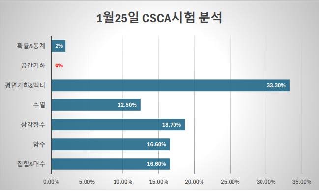 CSCA 1월 시험 분석|합격을 가르는 핵심 출제 경향 정리 CSCA 시험을 준비하는 학생들이 가장 궁금해하는 부분은 “어디서 많이 나오나?” “어떤 유형을 집중해야 하나?” 입니다. 이번 1월 25일 CSCA 시험은 12월 시험과 매우 유사한 흐름을 보였으며, 특정 단원이 합격을 좌우하는 명확한 출제 편중이 나타났습니다. 1월 CSCA 출제 영역별 비중 분석 전체 시험의 1/3 이상이 ‘평면기하 & 벡터’에서 출제되었습니다. 핵심 출제 경향 분석 1️⃣ 평면기하 & 벡터 – 합격을 좌우하는 핵심 파트 12월 시험에 이어 1월 시험에서도 평면기하 & 벡터가 가장 많이 출제되었습니다. 도형의 성질 이해 벡터의 방향·내적 개념 계산....... <img src="https://blogthumb.pstatic.net/MjAyNjAxMjhfNDMg/MDAxNzY5NTgyMDk5Njg2.T_yUOk9bh6oOP26gMkz_9XMvRhDDTUU0IYJJwVIMv1Mg.htAOnT3EXYkSsW3fJYSFxYfTHTmKmdZUrNA5YjynAjsg.PNG/%C4%B8%C3%B3.PNG?type=s3" />
