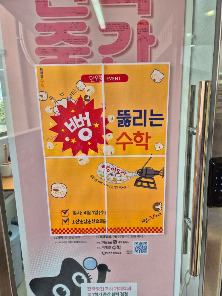 어제 미래엔수학에서는 아이들과 함께하는 특별한 이벤트✨ ** 뻥! 뚫리는 수학 파티 **를 진행했어요! 교실 가득 고소한 뻥튀기 향이 퍼지면서 시작부터 아이들 텐션이 최고였답니다 종이컵 한가득 담긴 간식과 함께, 평소보다 신이나서 문제를 풀고 있는 모습… 너무 귀엽고 기특했어요 “공부하면서 먹으니까 더 재밌어요!” “수학이 뻥 뚫리는 느낌이에요!” 아이들 한마디 한마디에 준비한 보람이 확 느껴졌어요 단순히 먹고 즐기는 시간이 아니라, 집중력은 UP! 스트레스는 DOWN! 즐겁게 공부하는 경험까지 챙긴 시간이었습니다. 앞으로도 우리 아이들이 수학을 “해야 하는 공부”가 아니라 하고 싶은 공....... <img src="https://blogthumb.pstatic.net/MjAyNjA0MDJfOTUg/MDAxNzc1MDkyOTc0MDU4.4cQ2tNPd-akNRdUdubhU90iS_mmoZKysYMAixHPgafMg.4BAREnTsXfV9awskC6vXZ8KXse5dG0rbhOwmNu0giXsg.JPEG/900%A3%DF20260401%A3%DF125607.jpg?type=s3" />