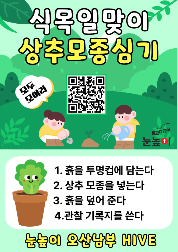 안녕하세요~ 오산 남부 하이브입니다~ 4월 5월 식목일을 맞이하여 오산 남부 하이브에서 상추모종 심기 행사를 합니다. 직접 상추 모종 심기도 하고 관찰 기록문도 써보고! 재미도 있고 의미 깊은 시간이 될 수 있게끔 많은 준비를 했습니다~ 준비한 만큼 많은 학생들이 좋아해 주길 바라며 상추 모종 심기 참여를 원하시는 분은, 각 러닝센터와 예스클래스의 네이버 예약을 통해 예약해주세요~ <img src="https://blogthumb.pstatic.net/MjAyNjAzMzFfNzYg/MDAxNzc0OTIzODI1MzM1.rfdOi0u4w0s8uBL_mfgBAuWRVFXNR5zYIwZ9gAw3wDsg.JlnatuVyli4FFDb8o9XClpvB96__O8na0Kujj5aVe0Ag.PNG/%BB%F3%C3%DF%B8%F0%C1%BE.png?type=s3" />