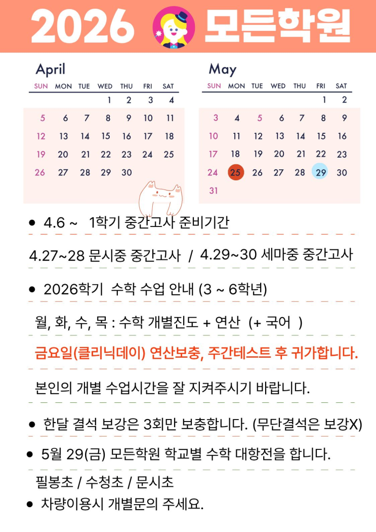 4월은 중간고사 준비의 시작 + 학습 습관을 결정짓는 시기입니다. “선행보다 중요한 건, 빈틈 없는 복습과 반복”입니다. 4월 모든학원 일정 4월은 학습의 방향이 결정되는 매우 중요한 시기입니다. 특히 4월 6일부터는 1학기 중간고사 준비기간에 들어가면서, 단순한 진도보다 개념 정리와 반복 학습이 핵심이 됩니다. 문시중은 4월 27~28일, 세마중은 4월 29~30일에 중간고사가 예정되어 있어, 학교별 시험 일정에 맞춘 전략적인 준비가 필요합니다. 이 시기에는 문제풀이 양보다 틀린 문제를 다시 이해하는 과정이 성적을 좌우합니다. 모든학원에서는 3~6학년 학생들을 대상으로 월~목까지는 수학 개별진도와 연산을 병행하고, 필요 시 국어....... <img src="https://blogthumb.pstatic.net/MjAyNjA0MDFfMTUx/MDAxNzc1MDQ3OTczNjg4.d-5rCrN-YcPTgNn2NOJCDPpCngqinyMcTtebQsrt050g.pGJXOugd1MwI-3T_NLIlUPHLxqnmif4zcRHUIKFsdGMg.PNG/image.png?type=s3" />