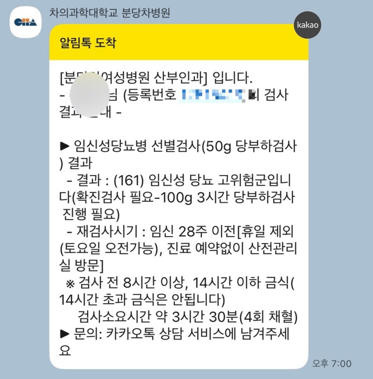 안녕하세요 나나입니다 저는 요며칠 임당검사로 긴장속에 지내고 있었습니다! 임신하고 살이 급격하게 찌는 내 모습도 싫고 몸무게 앞자리 변하는것도 현타 오더라구요 그 어떤 정밀검사보다 임당검사가 무서웠던 저는 식단관리 해가며 나름 신경썼기에 솔직히 무난하게 통과할줄 알았습니다. 아니 근데 이게 머선일.. !! 정확히 오후7시에 온 카톡은 절 너무 슬프게 했어요 ㅠ ㅠ 161이라니 .. 슬픔도 잠시 재검을 하루라도 빨리 하고싶어 바로 다음날인 토요일에 재방문했습니다. 잠깐 식단한다고 바뀌는거 없다기에 걍 빨리 검사하고 싶더라구요! 분당차는 토요일엔 오전진료만 하는데 ( 8:30-12:00 ) 재검은 넉넉히 3-4시간 걸린다고....... <img src="https://blogthumb.pstatic.net/MjAyNjAxMjBfMTI3/MDAxNzY4ODM2NDY4NDAy.EI4PL4avlW67toa5MwRRpscqj82C4090kznuL652fSAg.KNqJWszV6w9drV3MzHwYc4uEFpMHYei7asmpnlQwznEg.JPEG/output%A3%DF2892535302.jpg?type=s3" />