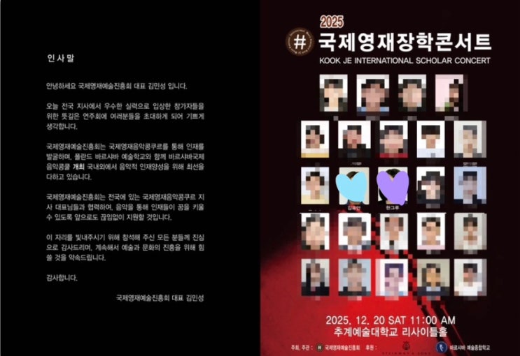 2025 국제영재장학콘서트 초등부 4학년 초등부 2학년 국제영재 콩쿠르에서 대상 받은 친구들 선착순 모집으로 콘서트를 개최하여 주셔서 대상 받은 친구들이 콘서트를 나가게 되었어요☺️ 기회를 주신 국제영재 콩쿠르 선생님께 감사드리며 떨리지만 잘 연주해 준 친구들도 고마워요 <img src="https://blogthumb.pstatic.net/MjAyNjAxMjJfMjUx/MDAxNzY5MDg4MTM2Mjk0.36AHlcpcwqhy40Cv5PVy9oUVSUvM9MKllb9li0nSQdYg.WOdco9DPKzOyjqrtz65RuHLgEVla_4C3UaEJTK2zJyog.JPEG/IMG%A3%DF1771.jpg?type=s3" />
