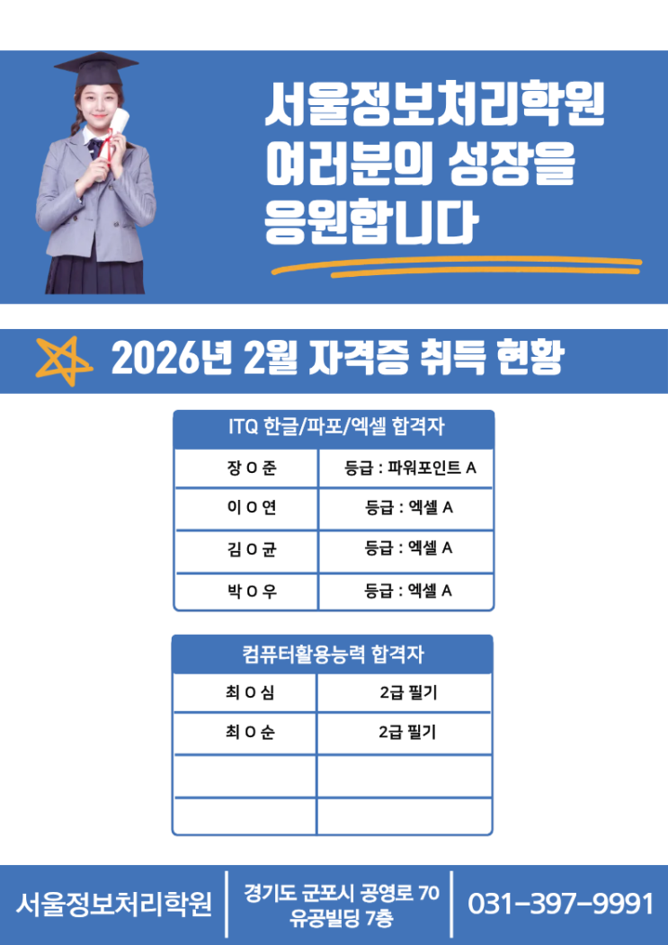 안녕하세요 산본 서울정보처리학원입니다! 자격증 취득을 목표로 학원을 찾고 계신 분들이라면 “정말 합격자가 많이 나오는 학원인지”, “커리큘럼이 체계적인지” 궁금하실 텐데요~ 이번 2월에도 산본 서울정보처리학원에서는 꾸준한 노력의 결실로 여러 합격자가 배출되었답니다! 우선 산본 서울정보처리학원의 교육 특징에 대해서 먼저 소개해 드리겠습니다! 기초부터 탄탄하게 다지는 수업으로 실무 중심의 반복 훈련과 시험 유형에 맞춘 전략적인 대비와 동시에 개별 맞춤 피드백을 통해 처음 배우는 분들도 충분히 자격증 취득이 가능하도록 지도하고 있습니다 특히 컴퓨터 자격증은 연습량과 이해도가 중요한데, 이 부분을 체계적으로 관....... <img src="https://blogthumb.pstatic.net/MjAyNjAzMjZfMTcy/MDAxNzc0NTExNjg1ODk1.10I75pdFB7a0UJnXPKCLFOxtfshFglL1Srs815Ib7Q8g.98snDSpSGqMSacFUE-je2mEoxf-_ROnr7BVTZAjbLJQg.PNG/image.png?type=s3" />