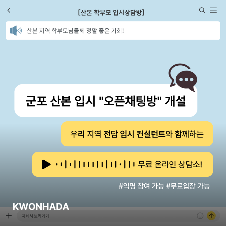 안녕하세요. [권하다] 학원입니다 :) 군포·산본 지역 입시 정보를 보다 정확하게 전달드리고자 우리 지역 전담 입시 컨설턴트와 함께하는 정보성 오픈 카톡방을 개설하였습니다. 채팅방 이름은 [산본 학부모 입시상담방]입니다. 해당 채팅방은 학원의 홍보 목적이 아닌, 정보의 불균형으로 어려움을 겪는 군포·산본 지역 학부모님들을 위한 무료 온라인 상담소라고 생각해 주시면 되겠습니다. 익명 참여 가능 비재원생 참여 가능 무료 상담 신청 가능 ▶ 군포 지역 고등학교 내신 및 입시 정보 ▶ 산본 지역 학교별 프로그램 및 진학 전략 ▶ 전국 단위 입시 이벤트 및 정보 공유 ▶ 학습에 도움이 되는 다양한 정보 제공 군포·산본 지역 입시는....... <img src="https://blogthumb.pstatic.net/MjAyNjAzMzBfMTQg/MDAxNzc0ODU4Mjk1ODcx.aklOSSDJatetdOqOYA4RTcBMnNXQIvcl0ANY423gYMEg.Kv86oUraQmUz__y0V-BBlY7WjShdPMiHIKTMgWBEngwg.PNG/3%BF%F9_%BA%ED%B7%CE%B1%D7_%BD%E6%B3%D7%C0%CF_%286%29.png?type=s3" />