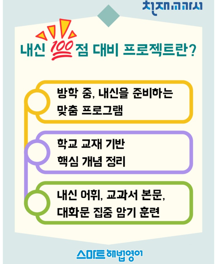 안녕하세요~ 연세 지니어스 영수 학원입니다. 날이 너무너무 추운 겨울 방학이네요 요즘 부쩍 성적 관련 문의가 많으신데요! 모든 아이들 중학교 내신 100 점 가능 합니다. 다만, 학생 본인이 평소에 최소한의 노력이 필요합니다. 내신 100 점 대비 프로잭트를 위해서 해야할 일은 평소에 단어 암기를 최소 5개, 문장3 개를 한다 내신기간에는 문법을 충분히 숙지후 꼼꼼한 개념 암기가 필수 입니다. 마지막으로 기출 문제를 풀면서 본인의 모르는것을 체크 한다. 하지만 현실에는 우리 아이들.. 단어 암기 힘들어 하죠... 초등학교 부터 차곡차곡 한다면 문제 없습니다. 중학교때 단어 시험을 시작하면.. 아마도 더욱더 힘들수 있습니다. ㅠㅠ 하....... <img src="https://blogthumb.pstatic.net/MjAyNjAxMThfMjQg/MDAxNzY4NzAxNzg4MjI5.gJWYUzt249PXfde0o7qauQPdDPD7z9LMq_MCwHDQ5ncg.ORr_aXwS9SjoSgFmKzh57l6Rn_tm-9njo5ICrSn6W7cg.JPEG/IMG_1674.jpeg?type=s3" />