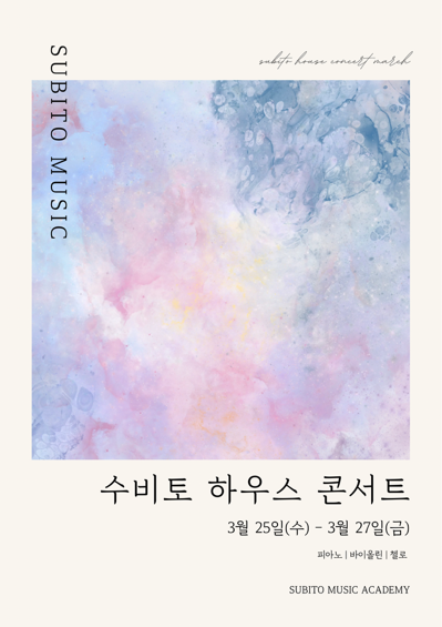 용인동백 피아노학원 바이올린학원 첼로학원 수비토음악학원 [3월 하우스 콘서트 일정 안내] ▪️3월 25일-26일: 피아노 콘서트 ▪️3월 27일: 스트링 콘서트(바이올린, 첼로) ❣️ 2026년의 첫 하우스 콘서트가 시작됩니다. 처음의 시작은 언제나 낯설기도, 설레기도 합니다. 올 한해동안 우리 아이들의 성장의 기록이 될 하우스 콘서트에 많은 관심과 참여 부탁드리며 연주 주간은 되도록 결석하지 않고 참여 할 수 있도록 부탁드립니다. 본 행사는 원내에서 학생들만 진행되는 연주회로 영상 촬영 후 클래스 노트 알림장에 업로드 될 예정입니다. ✏️ 하우스 콘서트는 수비토음악학원의 커리큘럼 중 하나입니다. 연주 무대에 대한 기본....... <img src="https://blogthumb.pstatic.net/MjAyNjAzMjNfMjEw/MDAxNzc0Mjc0MzQzMDkz.yrfPRhTKKNKRwI12VDNokTfnRJh5uDna-Q1vSDXvM1cg.5yUdqx0mJjM5JbV8x-TI8OpOzCQ6FI7-x2NFDVUdxmcg.PNG/%C7%CF%BF%EC%BD%BA%C4%DC%BC%AD%C6%AE%C6%F7%BD%BA%C5%CD.png?type=s3" />