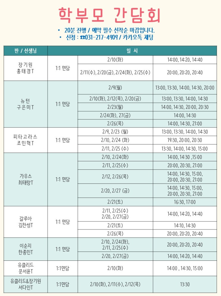 2/9~ 2/27 까지 재원생 간담회를 진행합니다 많은 신청 부탁드립니다^^ <img src="https://blogthumb.pstatic.net/MjAyNjAxMjhfMjEx/MDAxNzY5NTc3NDcwNzA4.041zKCp8ulvLzwxpNi8pJjenyNXzqNfJvPWEgJQOBLIg.rxdk_B76yJj783lB06D4EBhsONB9b869gUua86TbLUcg.JPEG/%B0%A3%B4%E3%C8%B8.jpg?type=s3" />