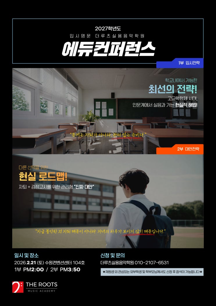2027학년도 실용음악과 입시, 지금 부모가 꼭 알아야 할 이야기 중,고등학교에 올라가고, 아이가 “실용음악과 진학을 생각해보고 있다”고 말했을 때 많은 부모님들이 가장 먼저 떠올리는 질문은 이겁니다. “학교는 어떻게 다녀야 하나?” “입시는 실기만 잘하면 되는 거 아닌가?” “지금 선택이 아이 인생에 너무 위험한 건 아닐까?” 특히 고교학점제 이후의 입시 환경은 학부모님 세대가 경험했던 입시와는 완전히 다릅니다. 정보가 부족한 상태에서의 선택은 의외로 돌이키기 어려운 결과로 이어지기도 합니다. 그래서 입시명문 더루츠실용음악학원에서는 2027학년도 실용음악과 입시를 준비하는 학생과 학부모님을 위해 특별한 에듀컨퍼....... <img src="https://blogthumb.pstatic.net/MjAyNjAxMjhfMjg1/MDAxNzY5NTgyNDk5ODQx.kA4akD1Q2KWZ6Lec9F4xnhJnjAe0uMfxOTKdH7uVmucg.NXUWyp_rlBOdU87GObYR3QfWToAQRc1nCJd_7anbcTQg.JPEG/2026_%BF%A1%B5%E0%C4%C1%C6%DB%B7%B1%BD%BA.jpg?type=s3" />