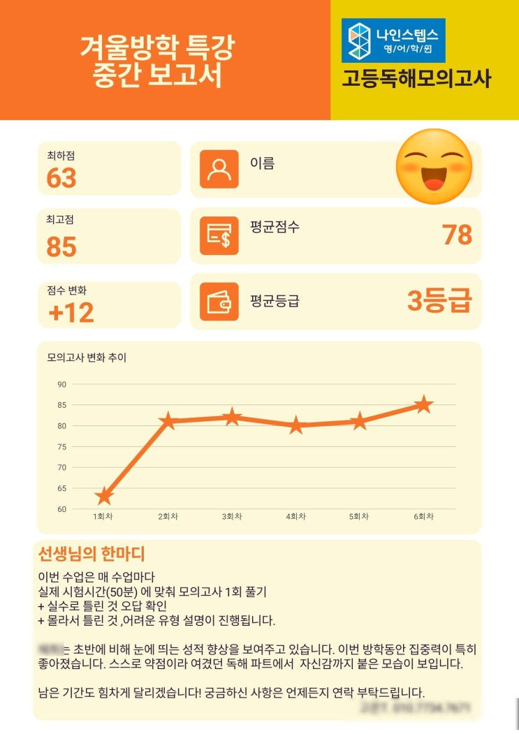 나인스텝스 영어학원 2026년도 겨울방학 특강에서는 다양한 강좌가 진행되고 있습니다. 그중에서도 고등학교 준비를 목표로 한 예비 중3 학생들의 독해 모의고사 수업이 특히 뜨거운 반응을 보이고 있습니다. 고등학교 진학 후 좋은 성과를 내기 위해서는 중3 시기의 체계적인 관리가 무엇보다 중요합니다. 이에 따라 ※예비 중3 학생들이 참여한 독해 모의고사 수업에 대해서는 담당 선생님의 특별 겨울방학 특강 중간보고서가 별도로 발송될 예정※입니다. 또한 중1·2부 학생들의 문법 특강은 특강 마지막 수업에서 최종 점검 테스트를 통해 학습 내용을 정리할 예정입니다. 이번 겨울방학 특강을 통해 학생들이 차근차근 쌓아 온 학습....... <img src="https://blogthumb.pstatic.net/MjAyNjAxMjlfMTAz/MDAxNzY5NjcwNDcxNDY4.dTaXf3s6s7Hi2AMPfJbl8TlJNivNfBgTXNfvx5a88B4g.g8Ysh0l63ouXKSEKPAtXIyed5vZYelpfz3KckC1nGHwg.JPEG/KakaoTalk_20260129_155107696.jpg?type=s3" />