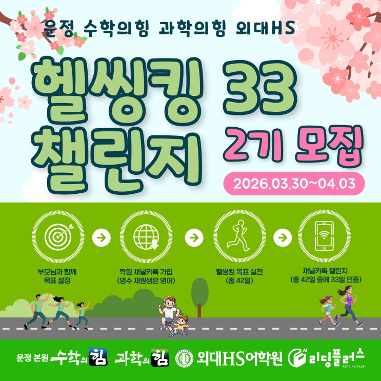 [모집] 33일의 작은 습관, '헬씽킹33 프로젝트 2기' 안녕하세요. 수학의힘∫과학의힘∫외대HS어학원에서 헬씽킹 33 프로젝트 2기를 모집합니다. 지난가을, 우리 아이들의 몸과 마음이 눈부시게 성장했던 '헬씽킹 33일 프로젝트 1기'를 기억하시나요? 33일간 매일 작은 습관을 지켜내며 스스로를 이겨냈던 그 아름다운 도전의 기록을 다시 시작하려 합니다. [다시 보기] 헬씽킹 1기: 33명, 33일의 아름다운 도전 일기! "습관이 몸에 배는 데는 66일, 그 시작을 위한 단단한 33일" 완벽한 변화를 위해선 66일이 필요하지만, 우리 아이들이 '성취'라는 달콤한 열매를 맛보기에 가장 적합한 시간....... <img src="https://blogthumb.pstatic.net/MjAyNjAzMzBfMTM5/MDAxNzc0ODcyNTQzODQx.VbHXmbgg6WIbf_iNCAkgq5mwbIzh7s5lNACDwSxYdycg.0o--IyzBfkZ_gH5rGsMqX08fARvJ7V0IGhncneAc6pkg.JPEG/2026-%C7%EF%BE%C5%C5%B7-33-%C0%E7%BF%F8%BB%FD-_-2%B1%E2-%B8%F0%C1%FD_%BC%B6%B3%D7%C0%CF.jpg?type=s3" />