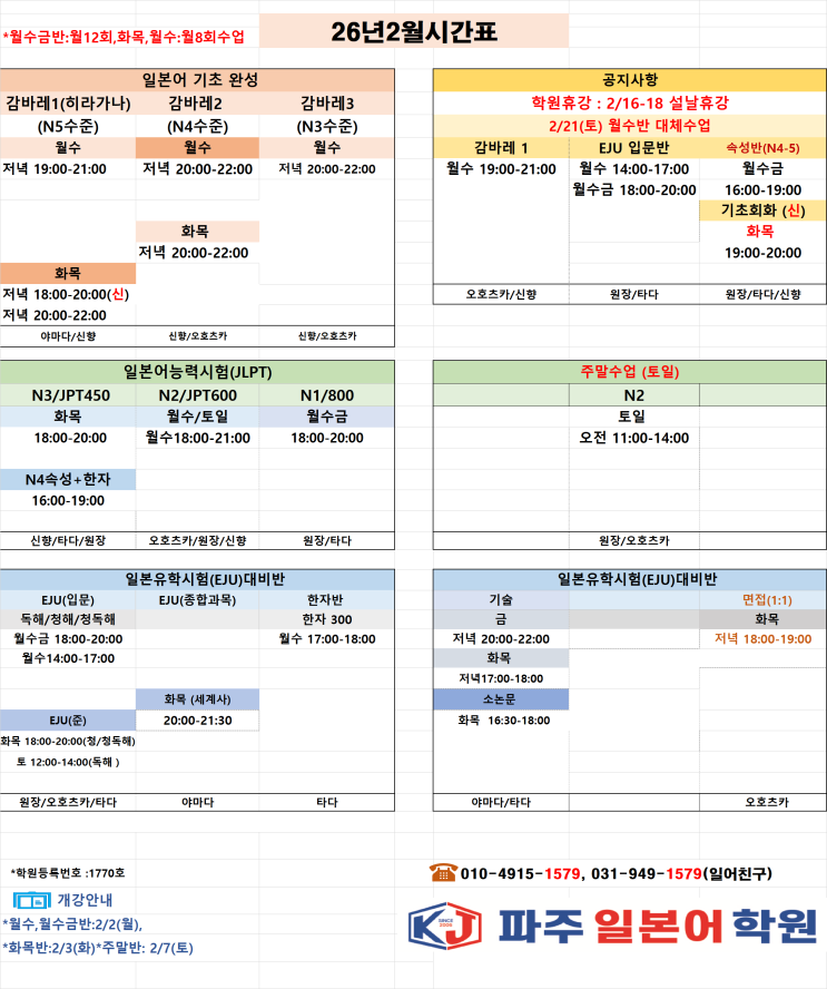 안녕하세요? 작년한해 많은 사랑 감사했습니다. 올 한해도 더욱 노력하는 학원이 되도록 하겠습니다. 새해 복 많이 받으세요.新年、明けましておめでとうございます。 2월 시간표 올리는 것이 늦었습니다. 죄송합니다. 저희 학원은 모든 기초반 강의는 주 2회(월수/화목반) 2시간씩 일본인샘 (회화) 1시간 한국인샘(문법)1시간으로 진행하고 있습니다. 수강비는 17만원 교재비 2권(22,000원) 입니다. 2월수업은 수업일수 부족으로 월수반은 2/21(토),3/2(월)까지이고 화목반은 3/3(화)까지 수업입니다. 2월 신규 히라가나부터 시작하는 반은 화목반 저녁 6:00-8:00 신설반 있습니다. 나머지 다른반은 레벨에 따라 달라 예전에 공부 하신 경험이 있....... <img src="https://blogthumb.pstatic.net/MjAyNjAxMjlfMiAg/MDAxNzY5NjUwMzg2NTI0.PoqCZgrl7KZDEnfdOWgd9eCmQotYinXAv_tX7Iw22tEg.O_Fyx43oK9bVHqMLXpdJqDQGvEHddpZ1lAr24JXxqgAg.PNG/202602%BD%C3%B0%A3%C7%A5.png?type=s3" />