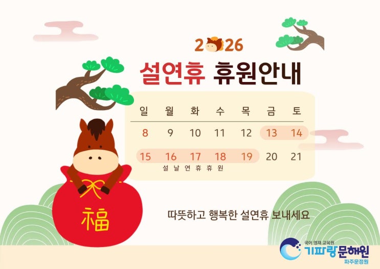 안녕하세요. 기파랑문해원 파주운정원입니다. 다가오는 2026년 설 연휴를 맞이하여 아래와 같이 휴원 일정을 안내드립니다. 휴원 기간 2026년 2월 13일(금) ~ 2월 19일(목) 정상 수업 재개 2026년 2월 20일(금)부터 정상 수업 및 상담이 진행됩니다. 휴원 기간 동안에는 전화 및 방문 상담이 어렵습니다. 이용에 불편이 없으시도록 일정에 참고 부탁드립니다. 새해 복 많이 받으시고 건강과 행복이 가득한 한 해 되시길 기원합니다! 즐거운 명절길 되시고 2/20(금) 건강한 얼굴로 다시 만나요^^ 감사합니다. <img src="https://blogthumb.pstatic.net/MjAyNjAxMjlfMjY2/MDAxNzY5NjczNDQyODUy.IBf_LwJ-vqkdtAKnB0LLea4MFx-Nun4w3JUWJbvXWX4g.uft-Akv3G_WS5WjGjmdAsNOAc_S-9OQZH6XzWhdmWXAg.JPEG/%BC%B3%C8%DE%BF%F8.jpg?type=s3" />