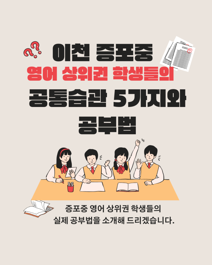 안녕하세요? 이천 증포동 , 갈산동에서 영어를 20년 이상 가르쳐오고 있는 이천맘행복쌤 Amy 입니다. 오늘은 이천 증포중 영어 상위권 학생들의 공통 습관 5가지와 증포동·갈산동·한내초 학부모님이 꼭 알아야 할 공부법에 대하여 알려드리려고 합니다. 이천 증포동·갈산동에서 학생들을 지도하다 보면 증포중 영어 상위권 학생들에게는 공통적인 공부 습관이 있다는 것을 발견하게 됩니다. 특히 한내초에서 올라온 학생들 중 영어 성적이 꾸준히 좋은 학생들을 보면 단순히 학원을 많이 다녀서가 아니라 올바른 공부 방법을 가지고 있습니다. 오늘은 증포중 영어 상위권 학생들의 실제 공부법을 소개해 드리겠습니다. 1. 단어를 매일 조금씩 꾸....... <img src="https://blogthumb.pstatic.net/MjAyNjAzMTVfNTkg/MDAxNzczNTc0OTEzNjE4.0CKKpSDobROe37ycXG7mLuKd9SAdaXeSqfdUFULA0Lgg.6sTnjje83e-HBr7WaM_EyrRBbQzzE2goRxS83QjYxYgg.PNG/260315%BA%ED%B7%CE%B1%D7.png?type=s3" />