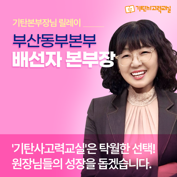 안녕하세요. '기탄사고력교실'이 창립한 2016년 12월부터 현재까지 교육전문가로 원장님 양성을 위해 끊임없이 노력하며 원장님들의 자존감과 자긍심을 고취시키는 부산동부본부장 배선자입니다. Q. 기탄사고력교실과 함께하게 된 계기, 그리고 그 선택의 이유는 무엇이었나요? 25년 전, 구체물과 보드게임을 활용해 만 5세~초5학년 아이들을 가르치면서 연산 오류와 문장 이해가 부족하다고 느끼며 수업의 질 향상을 위해 기초교육의 중요성을 알았습니다. 그래서 2016년 '기탄사고력교실' 대표님을 만났고 기탄수학, 기탄한글, 기탄국어, 구체물, 보드게임, 매쓰코딩까지 아이를 위한 다양한 수업으로 알차게 구성된 프로....... <img src="https://blogthumb.pstatic.net/MjAyNjAyMDJfMTUz/MDAxNzcwMDIyMDg2Mzc3.TNFVQLY65PWgpJrdUTqwSgFcT2SynJnqtOFIvj3zW1cg.cCmr0D2dkNrl1hQzIs3bqv8QreJ8a6qbhS6mMn9O6qwg.PNG/%BA%CE%BB%EA%B5%BF%BA%CE%BA%BB%BA%CE_%C1%A4%B9%E6%C7%FC_%B1%E2%C5%BA%C0%CE%C5%CD%BA%E4%280%BA%D0%C8%AB%29_%BC%F6%C1%A4.png?type=s3" />