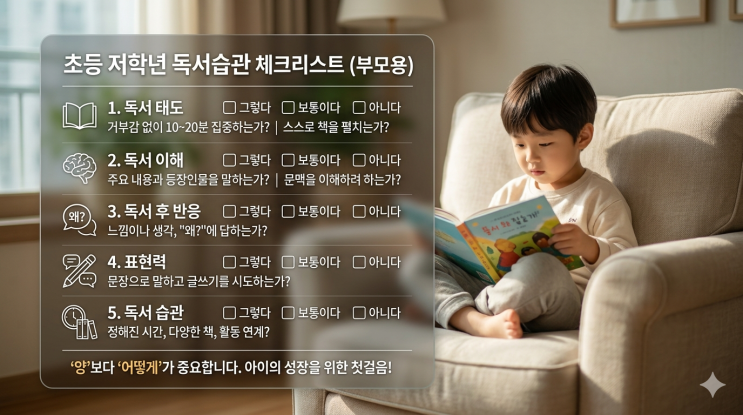책읽기가 중요해진 요즘! 답십리 전농동에서 독서에 관심이 많으신 학부모님들을 위해 우리 아이 독서, 제대로 하고 있는지, 간단히 살펴볼 수 있는 독서습관 체크 리스트 소개 해드릴께요! 왜 초등 저학년 때 독서습관이 중요한가 초등 1~3학년은 단순히 글을 읽는 단계에서 벗어나 내용을 이해하고 생각을 만들어가는 시기입니다. 이 시기를 놓치면 이후에는 글은 읽지만 이해하지 못하는 아이 문제는 풀지만 생각을 말로 표현하지 못하는 아이로 이어질 가능성이 높습니다. 특히 중·고등 학습에서는 국어뿐 아니라 사회, 과학까지 모두 독해력 기반 학습이기 때문에 기초가 매우 중요합니다. 솔루니 리딩클럽 특징 1. 엄선된 도서 선정 아이 수....... <img src="https://blogthumb.pstatic.net/MjAyNjAzMjdfMjc2/MDAxNzc0NTk5NzE1Nzky.Xzi27glIy_4YQ91abF3h_hYtekP5lTeI1SPKyGIX3EQg.BuECbiA6utQuNQBkNcEPGlFZvC9SSr9oaZe7Vx2WDFIg.PNG/%C3%CA%B5%EE%C0%FA%C7%D0%B3%E2%B5%B6%BC%AD%C3%BC%C5%A9%B8%AE%BD%BA%C6%AE.png?type=s3" />