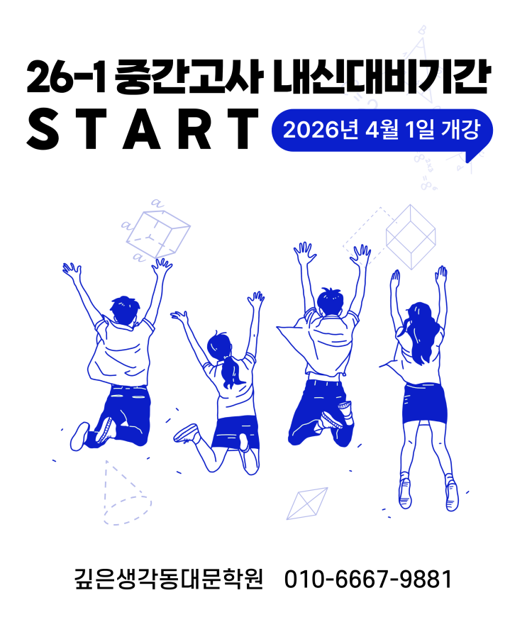 다가오는 4월 1일부터, 중간고사 대비 기간에 맞춰 내신 집중 수업이 본격적으로 시작됩니다. 시험까지 남은 시간은 제한되어 있지만, 이 시기의 학습 방향과 밀도에 따라 결과는 충분히 달라질 수 있습니다. 왜 ‘지금’이 중요한가 중간고사는 단순한 시험이 아니라 현재 학습 상태를 그대로 보여주는 지표입니다. 이 시기에 ✔️ 범위를 정확히 이해했는지 ✔️ 문제에 적용할 수 있는지 ✔️ 실수를 줄일 수 있는지 이 세 가지가 정리되지 않으면 공부한 만큼의 결과가 나오기 어렵습니다. 깊은생각 강사진은 다르게 접근합니다 결과로 증명해온 강사진이 단순한 문제풀이를 넘어 “점수로 이어지는 학습”을 설계합니다. 학생이 어....... <img src="https://blogthumb.pstatic.net/MjAyNjAzMzBfMjAx/MDAxNzc0ODYzMzAyMDM2.2slbzwgloF_peSuUwBwXgDFLREk9A0JbmsZgMX8UcFYg.0B49AIT41R7vW4iWo3CCtdRj-5p6HUOr9s0ptQWPgrgg.PNG/260330_%B1%ED%BB%FD_%B5%BF%B4%EB%B9%AE_%C1%DF%B0%A3%B3%BB%BD%C5_%BD%C3%C0%DB_%C6%F7%BD%BA%C5%CD.png?type=s3" />
