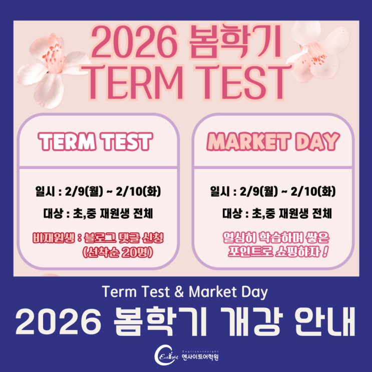 안녕하세요? 언제나 올바른 영어 교육을 위해 매 순간 최선을 다하는 원주 무실동 영어학원 엔사이트어학원입니다. 2026 봄학기 개강 안내 드립니다. 재원생 안내 적용 대상: 초등부 및 중학교 전학년 재원생 별도의 신청 없습니다. 시험일정: 2월 9일(월)부터 2월 10일(화)까지 정규 수업 시간 내 실시, 소요 시간은 약 90분, 시험 전후 마켓 쇼핑 활동 진행 성적 결과표는 2월 23일(월) 이후 개별적으로 전달됩니다. 봄학기 시작일: 3월 5일 (목) 마켓 포인트 적립 안내 - 초등 정규 과정: 독서 퀴즈 성취도, 북로그 작성 여부, 시험 및 활동 참여 성실성, 수업 중 태도, 생일 이벤트, 각종 수상 기록 등 종합 반영 - 예비중(초6) · 중등 · 마....... <img src="https://blogthumb.pstatic.net/MjAyNjAyMDJfNjUg/MDAxNzY5OTgzMTcwOTI5.ozot763rt2JzIYnAF3ZhiDt2qDNUsHyEz1STECxcHaMg.8zK4j6ynaoQBygT6OvgIV3RZmII_yfv5t30_OGHe-m4g.PNG/%BD%E6%B3%D7%C0%CF.png?type=s3" />