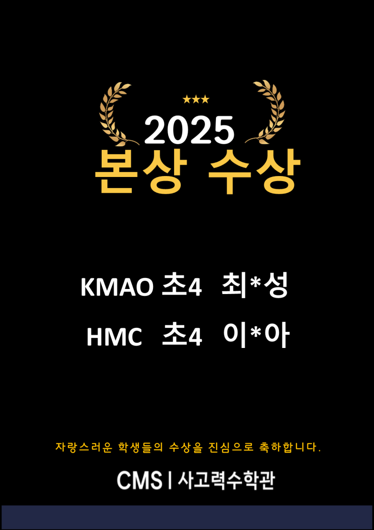 그동안 차곡차곡 쌓아온 수상 실적을 정리해 올립니다 너무 오래되서 누락된 자료들도 많지만~~^^ cms 키즈들이 사고력의 힘만으로 이뤄낸 성취라 더반짝반짝 빛나네요. 우리 아이들의 열정이 만들어낸 영광스러운 순간!!! 26년도 화이팅 하겠습니다. cms 사고력수학 강릉시 솔올로 66 3층 033-643-8620 https://www.creverse.com/mt/gangneung/ <img src="https://blogthumb.pstatic.net/MjAyNjA0MDJfODYg/MDAxNzc1MTIxMDg1MjAw.S41QaYWoYHZBAw6KnEeRMd_rErSBRPexj36QuyvBLm4g.s1Evi0voc6TL_8iEkWrufRtvpvMpmTCSVx_j4WKgWvcg.PNG/2025__%BA%BB%BB%F3_poster.png?type=s3" />