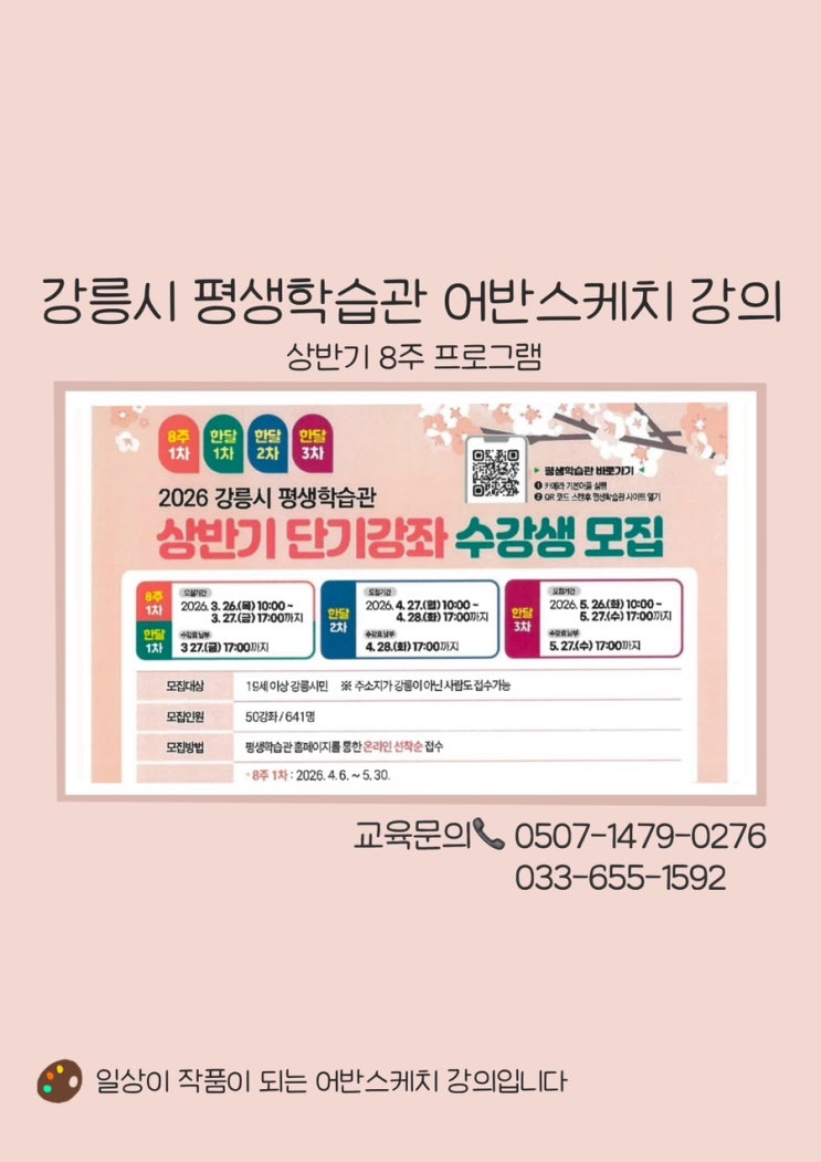 잔잔한 일상 속에서 마주하는 풍경을, 나만의 시선으로 담아내는 시간. 이번 상반기, 강릉의 계절을 손끝으로 기록하는 특별한 여정을 시작합니다. 빠르게 지나가는 하루 속에서도 우리는 늘 아름다운 장면들 사이를 살아가고 있습니다. 골목의 햇살, 바람에 흔들리는 나무, 카페 창가의 따뜻한 순간까지. 어반스케치는 그 찰나를 붙잡아 ‘기억’이 아닌 ‘기록’으로 남기는 작업입니다. 이번 강의는 단순히 그림을 배우는 시간이 아니라, 관찰하고, 느끼고, 표현하는 힘을 기르는 과정으로 구성되어 있습니다. 어반스케치, 왜 특별할까요? 1. 일상이 작품이 되는 경험 멀리 가지 않아도 괜찮습니다. 내가 머무는 공간, 내가 바라보는 풍경이 그....... <img src="https://blogthumb.pstatic.net/MjAyNjAzMjNfMjgz/MDAxNzc0MjI2Njc2NzA0.vxym5KM9t3KuLG5qzLGxj-DoaC0DmCTRMCNfBCnS9DMg.F99mFS-t6Df23TdE6mZCWbc4sMlT1g3dplM0T3cOThAg.JPEG/IMG%A3%DF3731.JPG?type=s3" />