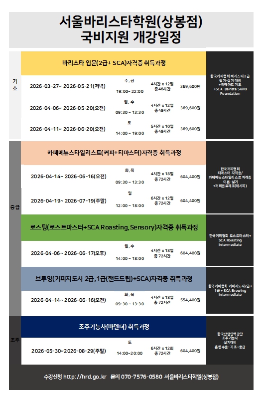 벌써 여기저기 꽃망울이 보이는 것을 보니 봄이 오고 있나 봅니다~~ 3월 넷째주 서울바리스타학원 상봉점 개강일정 공지합니다. 아직 무언가를 시작하지 못하셨다면!! 26년을 알차게 보내고 싶으시다면!! 서울바리스타학원과 함께 커피의 향에 빠져보시는 건 어떠실까요~~ 바리스타 자격증과정부터 카페메뉴, 로스팅까지 다양한 과정들이 준비되어있습니다^^ <img src="https://blogthumb.pstatic.net/MjAyNjAzMjNfMTUx/MDAxNzc0MjUwMzA3MDY0.st2cnOKL4zddcsmlj4HRINhhNgtiixOK5Byj1G7k44gg.DtPF6748juZVDgR-O61rZ_i9k1_yfVZzF_wcw7x-E0gg.JPEG/20260323_161711.jpg?type=s3" />