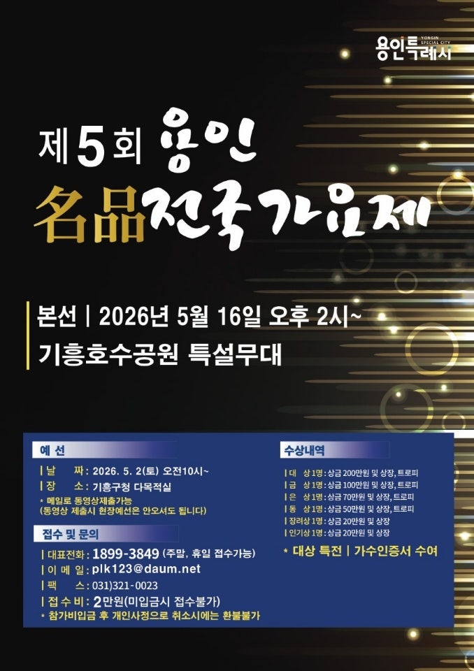 제 5회 용인 名品(명품) 전국 가요제 가요제 레슨도 착한실용음악학원과 함께! 가요제 입상, 착한실용음악학원과 함께 하면 더 쉬워집니다♥ 착한실용음악학원에서는 음악을 사랑하는 모든 분들을 위해 다양한 가요제/오디션 전문 레슨을 진행하고 있습니다. 가요제/오디션에 참가하는 많은 수강생들의 수상이 끊임없이 이어지고 있으며, 그 결과로 실력과 가능성을 입증받은 수강생들이 점점 더 늘어나고 있습니다. 가요제/오디션은 착한실용음악학원과 함께!! 수강문의는 언제나 환영입니다 02-977-4005 | 010-5287-6665 제 5회 용인 名品 전국 가요제 안내입니다. 예선 | 2026년 5월 2일 (토) 오전 10시~ 장소 | 기흥구청 다목적실 * 메일....... <img src="https://blogthumb.pstatic.net/MjAyNjAzMzBfMjA3/MDAxNzc0ODQ1NzY0ODY2.UyzgBMUsxPRy4a0YpqIqObKFeErrdIdj3wNzvs_S_lkg.FThg0s9BE6jFnw1Zy5GGI5nUWsZduBLet7f69Py-G2Ug.JPEG/KakaoTalk_20260330_115807297.jpg?type=s3" />