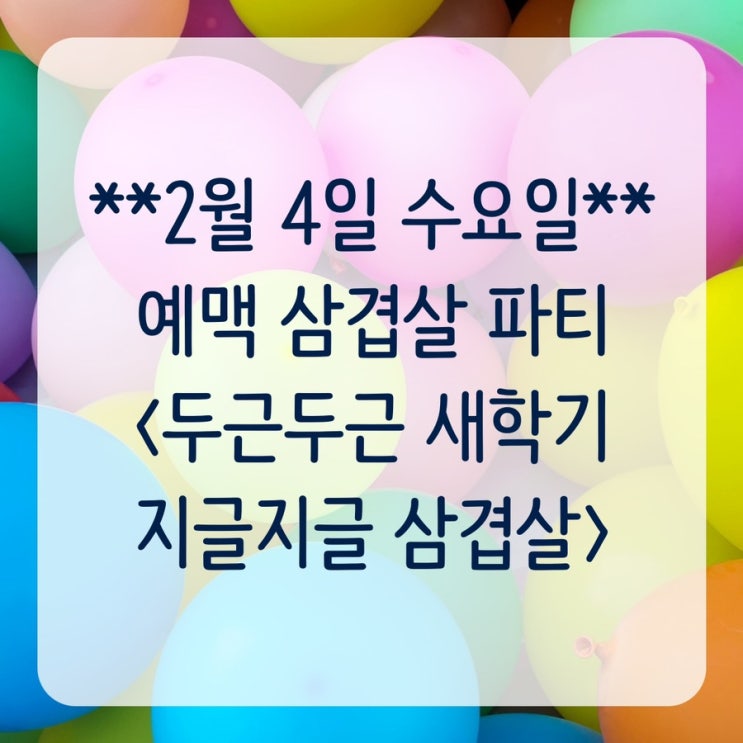 안녕하세요~ 예맥학원입니다! 오늘은 우리 예맥 친구들이 아주 기대하고 있는 소식을 전해드리려고 왔는데요~~!! 예맥만의 신학기 이벤트!! 삼겹살 파티 공지를 해드리려고 합니다 예맥 친구들의 새학기를 응원, 격려하는 의미로 특별히 기획된 이벤트랍니다ㅎㅎ 날짜는 바로바로 2월 4일 수요일이구요~! 이제 일주일도 안남았다는 사실! 이번 삼겹살 파티는 특별히 친구초대도 1명까지 가능해요~!! 친구랑 같이 먹으면 두 배로 맛있겠죠~?? 맛있게 먹고, 영어 빙고게임과 O/X 골든벨 등 재미있는 행사도 준비되어있으니 많이많이 기대해주세요~! <img src="https://blogthumb.pstatic.net/MjAyNjAxMjlfMTM0/MDAxNzY5NjYzNjQzODY3.n-7pQUqtoT66x_lMXHrmew28oS9-Ut2IzkEdLilTz08g.MxKqNjeZ8-qDryprYqpyb_ySOgqkbz2Bx6VXr_AzsxAg.JPEG/IMG%A3%DF3551.JPG?type=s3" />