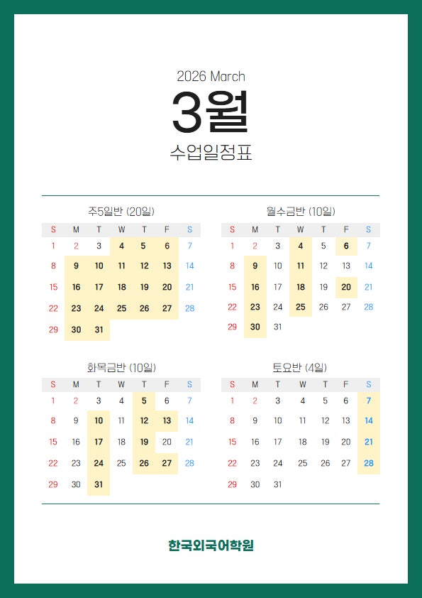 안녕하세요! 청주 1등 토익학원 한국외국어학원입니다⸜(*ˊᗜˋ*)⸝ 오늘 들고온 소식은 3월 수업 일정에 대해 알려드리려고 합니다~!~! 주 5일 매일반, 주 3일반, 토요반까지 함께 일정 보러 가볼까요~?~! 전체 일정표 공유 드립니다! 주 5일 매일반의 경우 평일에 매일 진행되는 수업으로 한 달 커리큘럼으로 진행되고 있으며, 총 20일 수업으로 진행됩니다~! 주 3일반의 경우 " 월수금 " 과 " 화목금 " 으로 각각 10일 수업으로 진행되며, 금요일은 격주 수업이 들어가게 됩니다! 월수금반의 경우 첫째주와 셋째주에 금요일 수업이 진행되고 있습니다 화목금반의 경우 둘째주와 넷째주에 금요일 수업이 진행되고 있습니....... <img src="https://blogthumb.pstatic.net/MjAyNjAyMDlfMjQy/MDAxNzcwNjAwOTI4MTk4.6c6LQ1DzL1iJEHMX5f4KibZDGVWfwCmL8ItFi77vhrog.mTkiveMWmsF8TpV1CjJ36o66pv9d_yqchyrJQ2RgXR8g.JPEG/3%BF%F9%C0%CF%C1%A4%C7%A5_2603.jpg?type=s3" />