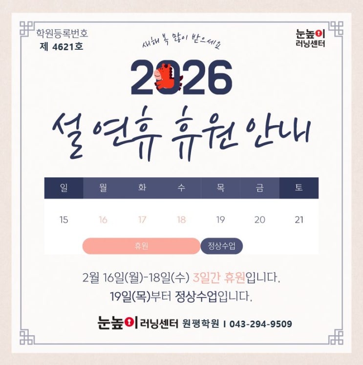 안녕하세요 ~ 눈높이 러닝센터 원평학원입니다 ! 2월 16일부터 18일까지 3일간 설연휴로 휴원임을 안내드립니다 ! 19일 (목)부터 정상수업하오니 일정 참고해주시길 바랍니다 가정에 행복이 깃들길 바라며 2026년도 평안하시고 복 가득하시길 바랍니다 문의사항이나 보충일정은 담당 선생님과 소통해주시면 됩니다 언제나 믿고 맡겨주셔서 감사합니다 <img src="https://blogthumb.pstatic.net/MjAyNjAyMTJfOTkg/MDAxNzcwODYwODY4MTgw.2z7CpzyGW9mZHP72vmFjFv2Q6CgpL_XLYifHQQcbivIg.LnWGqZmW218avvNrpW7v4o63S95cyKnP7JbXRJ4TEJkg.JPEG/%BC%B3-%BF%AC%C8%DE-%C8%DE%BF%F8-%BE%C8%B3%BB-002.jpg?type=s3" />