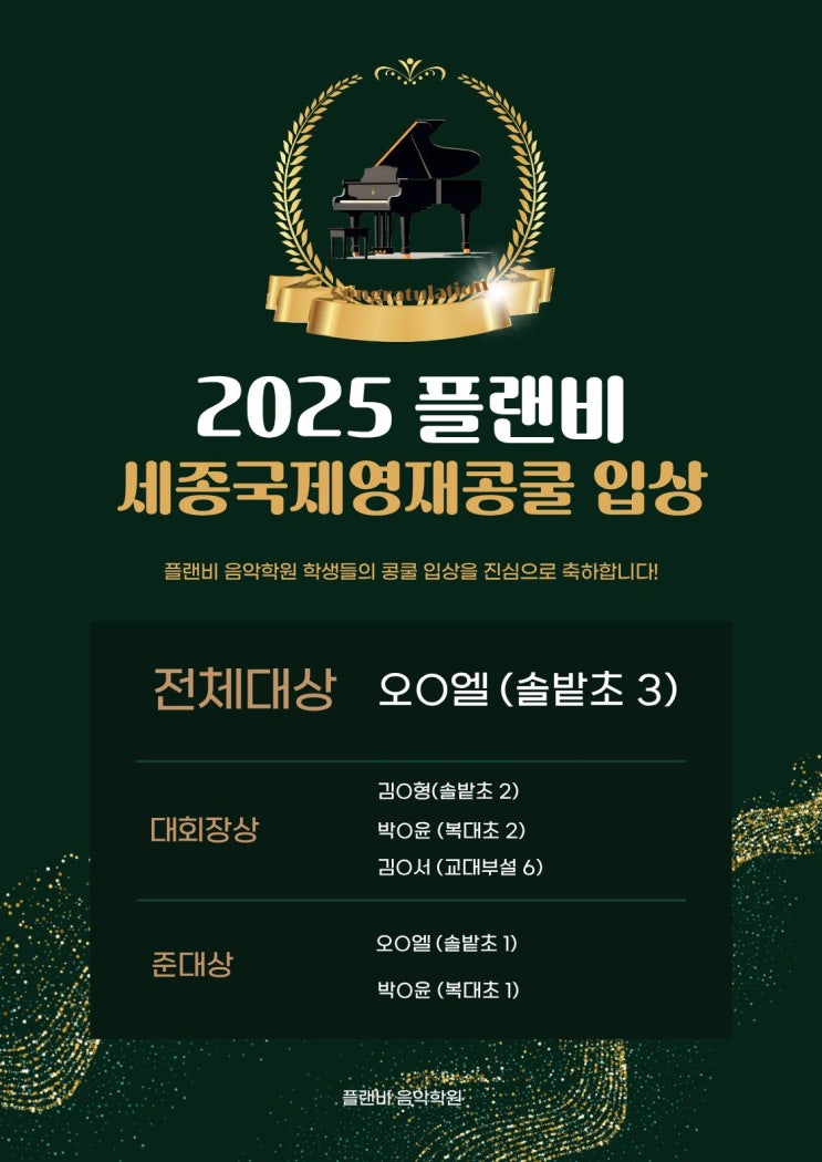 작년 11 우리 플랜비 아이들이 피아노와 바이올린 콩쿨에 도전했습니다 콩쿨 결과도 중요하지만 아이들이 무대에 서기까지의 연습과정과 스스로 한 곡을 완성해 나가는 경험이 더 소중하다고 생각해요 이번 콩쿨을 준비하며 아이들은 매주 작은 목표를 세우고 긴장되는 부분을 하나씩 극복해 나갔습니다 처음엔 자신 없어 하던 아이도 무대에 서겠다는 마음 하나로 끝까지 포기하지않았어요 전원 입상하는 뿌듯한 결과와 자신감을 안고 오게 되었습니다. 고생한 친구들 모두 모두 수고했어요. <img src="https://blogthumb.pstatic.net/MjAyNjAxMTRfMTE4/MDAxNzY4Mzc5NTQ3OTUw.MEfdamuQ5gIXvvFA3vEun4xwHFwHF7fqOTr2yM21YoIg.kUUZFbAn8I7h3FEhSkGfafcC6pmngCbPpC_vz9VLX3sg.JPEG/%C1%A6%B8%F1%C0%BB_%C0%D4%B7%C2%C7%D8%C1%D6%BC%BC%BF%E4._%284%29.jpg?type=s3" />