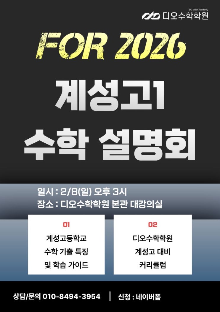 안녕하세요? 계성고등학교 수학전문 디오수학학원입니다. 2026학년도 계성고 신입생 및 학부모님을 대상으로 계성고 수학 설명회를 진행하려고 합니다. ▶ 일시 : 2/8(일) 오후 3시 ▶ 장소 : 디오수학학원 본관 1강의실 ▶ 대상 : 계성고1 신입학생 및 학부모님 ▶ 내용 ① 계성고등학교 수학 기출 특징 및 학습가이드 ② 2022 개정교육과정 IN 계성 ③ ALL ABOUT 계성 ④ 2026학년도 계성고 대비 커리큘럼 ▶ 신청 https://naver.me/5gY50EcR ▶ 문의 https://open.kakao.com/o/sSiDcMFh 계성고 입학을 앞둔 시점에서 궁금하실 만한 정보 알차게 준비했으니 꼭 참석하셔서 도움 될만한 정보 얻어가시길 바랍니다. 감사합니다. 설명회 때 뵙겠습....... <img src="https://blogthumb.pstatic.net/MjAyNjAxMjlfMTg3/MDAxNzY5NjkyNzE5Mjgw.Vmq2-LN83AAA7lBoTuhwtOPvCzyE1rZ0LKzeZLLXdi0g._v3fZeyr9DHnuOXS1Iw25BYUYpNjB8r1ZlflyxgCEFwg.JPEG/%C1%A6%B8%F1%C0%BB_%C0%D4%B7%C2%C7%D8%C1%D6%BC%BC%BF%E4..jpg?type=s3" />