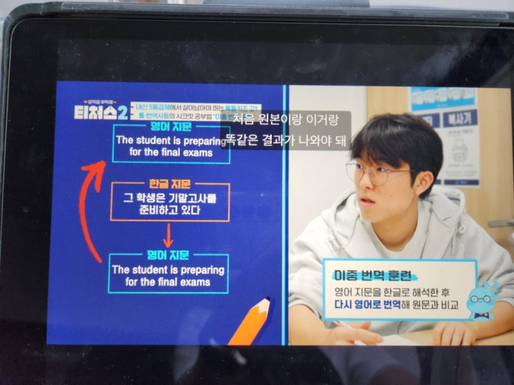 유니콘의 영어학습방법 이중 번역 티처스 '조정식'선생님도 이렇게 지도합니다. 티처스에 나왔던 영어 지문 완전 학습을 위한 학습법 이중 번역 영어 지문을 - 한글 문장으로 - 다시 영어 지문으로!! 유니콘의 콘이들도 이렇게 학습하고 있습니다. 영어 지문의 이중 번역 - 왜 좋을까요? 단순히 해석을 하는 것을 넘어 다시 영어로 바꿔야 하는 다음 학습을 위해 1. 해석이 상세해집니다. - 영어는 눈에 보이도록 설명하는 언어입니다. - 예를 들어 : 아가가 잔다. -> 한 명의 아기가 잔다. : A baby sleeps - 문장 앞에 a라는 표현을 넣기 위해 해석이 상세해집니다. 2. 상세한 해석은 영어 지문에 대한 완벽한 이해로 이어집니다....... <img src="https://blogthumb.pstatic.net/MjAyNTExMjVfOTQg/MDAxNzY0MDQ3NTE0MDAz.gvbCiAGXHW4WO__Teh8aVcJ5NfkAlN3B5rhDOiMTdUUg.0phz4mVmRvEh3sAdkIUsx78Pz8ApYM9d-aQsC08Sjkkg.JPEG/900%A3%DF20251121%A3%DF132046.jpg?type=s3" />