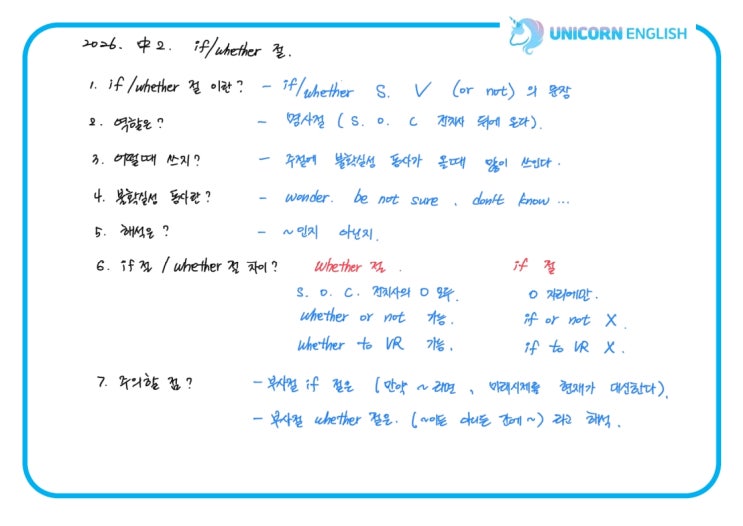 영어문법은 먼저 그 개념을 잘 아는 것에서 시작해야 합니다. 아래의 개념을 먼저 여러 번 읽어보고, 빈 종이에 그 내용을 연결해서 적어보세요. 완전히 다 적을 수 있으면 문제를 풀 준비가 된 것입니다. 여기서 잠깐, 용어의 개념이 어렵다면 꼭 선생님에게 물어보고, 용어 개념을 꼭 확인하세요. 질문은 천만 번 해도 됩니다~ 늘 환영입니다.^^ 어려운 것, 헷갈리는 것을 확인하는 것은 아주 좋은 학습방법입니다~! 친구나, 동생에게 설명하듯이 학습해 보세요. "왜 답인지, 왜 오답인지" 확인하고, 스스로 이해되도록 설명하듯 학습하는 방법은 좋은 결과를 만듭니다. 모두 모두 파이팅~!!!^^ <img src="https://blogthumb.pstatic.net/MjAyNjA0MDNfMjQ2/MDAxNzc1MTk0MTMxMzE2.OnUBdD3t5fgi01hYQ_Y_icqodE58I5gnW4-996BpNiEg.Z3xXM-Z9Fr9vx_vRN3hi3Fi1VEZUwo3EChKdRMU2aq0g.JPEG/if._Whether_1.jpg?type=s3" />