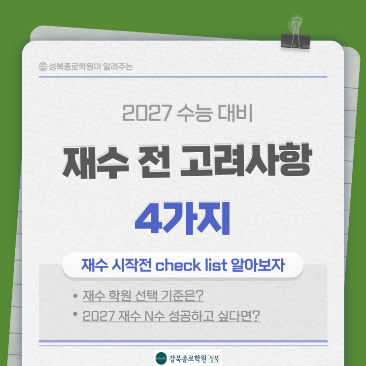 재수해야 할지 고민될 때 꼭 봐야 할 기준 4가지 (재수학원선정기준 추천 성북종로학원) 안녕하세요 재수 n수 입시전문학원 성북종로학원입니다. 수능이 끝나고 나면 마음이 복잡해지는데요 “한 번만 더 해보면 다를 것 같은데”라는 마음이 들기도하죠 그런데 재수를 고민하는 대부분의 학생과 학부모를 만나보면 정작 중요한 질문은 아직 정리되지 않은 경우가 많습니다. 재수를 할지 말지보다 먼저 “왜 지금 이 선택을 고민하고 있는지”부터 정리해야 합니다. 오늘 포스팅에서는 재수 시작전 고려해야할 4가지 사항 에 대해서 알려드리겠습니다. 1. 목표 대학과 현재 성적간의 전략이 있는가? 재수를 고민하는 많은 학생들이 목표 대학은 분....... <img src="https://blogthumb.pstatic.net/MjAyNjAxMjNfNjkg/MDAxNzY5MTQ3OTU3Mzgx.2Z0E6i_XEojM0JbJl06Fe8-AY_yEXDPORwOue_5e70Mg.MGilVgt9Rb02OQu7ACV_LaYn2dL_c2ncRbrQHSQt1xog.PNG/%C1%A6%B8%F1%C0%BB_%C0%D4%B7%C2%C7%D8%C1%D6%BC%BC%BF%E4._%289%29.png?type=s3" />