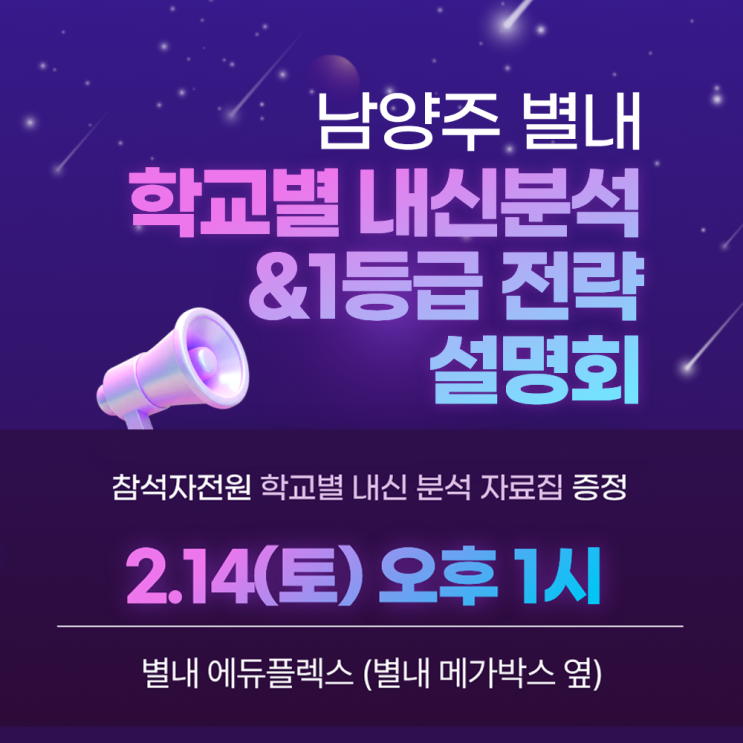 새 학년이 시작되면 가장 먼저 다가오는 평가는 ‘첫 시험’입니다. 하지만 이 시험의 의미를 단순히 점수 확인으로만 이해하기에는 지금의 내신 구조는 훨씬 복잡해졌습니다. 첫 시험은 아이의 학습 내용뿐 아니라 공부 시간 배분, 복습 방식, 시험 준비 구조가 학교 평가 기준에 맞게 작동하고 있는지를 확인하는 과정입니다. 에듀플렉스 별내지점은 첫 시험을 성적의 시작점이 아니라, 학습 방향을 점검하고 조정하는 기준점으로 보고 있습니다. 이번 학부모 설명회에서는 별내 지역 학교의 내신 흐름과 최근 입시·평가 변화 속에서 첫 시험을 어떻게 준비해야 하는지를 구체적인 기준과 실행 전략 중심으로 안내드릴 예정입니다. ✅ 대상학교....... <img src="https://blogthumb.pstatic.net/MjAyNjAxMjlfMTgw/MDAxNzY5NjY4MDc0MDAy.sv8bkUzAAYoc75gEQ-4BhAH5e_Ttqha8glgSLpuCvcUg.3UAP0uoNgJZHw0c8Mh7RY6hPOFEvr3_snDi_gBF4Bq4g.PNG/%BA%B0%B3%BB_%BD%E6%B3%D7%C0%CF.png?type=s3" />