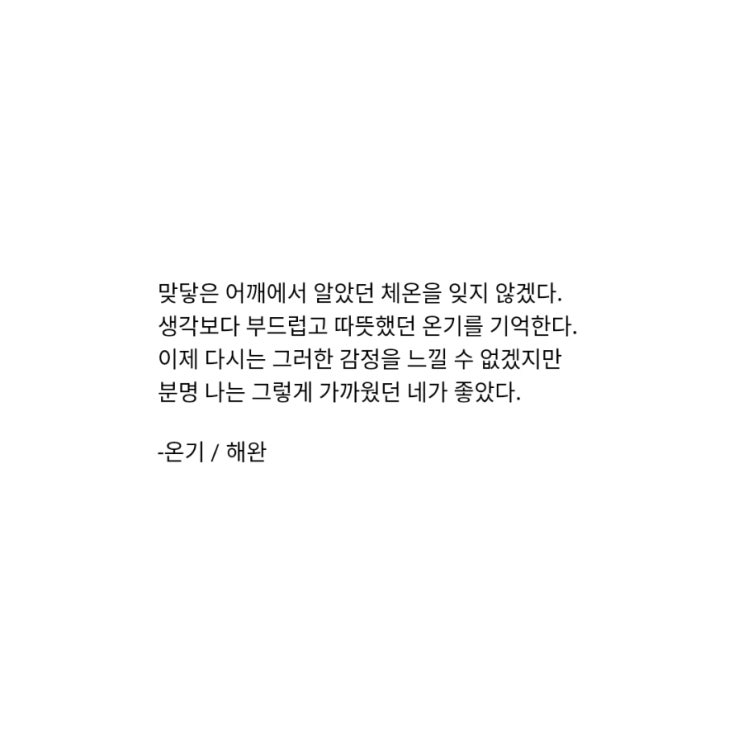 맞닿은 어깨에서 알았던 체온을 잊지 않겠다. 생각보다 부드럽고 따뜻했던 온기를 기억한다. 이제 다시는 그러한 감정을 느낄 수 없겠지만 분명 나는 그렇게 가까웠던 네가 좋았다. -온기 / 해완 <img src="https://blogthumb.pstatic.net/MjAyNjAzMjhfMjc1/MDAxNzc0NzA5ODQyMTY0.MQV8QpKvf8PpWXE-Rqc3BKE--B8Qk-7EMhn8lVPHp5Eg.P1K79aO1MgGVLo7QcOUUW6lihP9GxG_Wg2YVoD2aStQg.JPEG/900%A3%DF20260328235641.jpg?type=s3" />