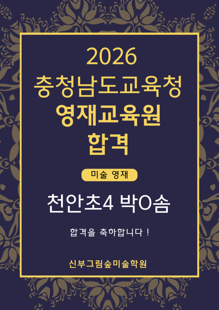 안녕하세요-! 신부초등학교 후문 앞에 위치한 신부그림숲미술학원 입니다 ^^ 2026년 붉은 말의 해가 밝았습니다. 우리 신부그림숲 친구들, 학부모님들 모두모두- 강인한 말처럼 힘차게 달리고, 붉은 기운처럼 열정과 행운이 가득한 한 해 되시길 바랍니다! 오늘은 기쁜 소식을 들고 찾아왔는데요- 저희 신부그림숲미술학원에서 2026년 충청남도교육청 미술 영재교육원 합격자가 배출되었습니다-! 이번 합격은 우리 합격자 다O학생이 유치부였던 2021년 7살부터 현재 2026년 12살로 올라가는 지금까지 신부그림숲미술학원에서 성실하게 쌓아온 그간의 노력과 기본기가 시험장에서 그대로 빛을 발한 결과였습니다. 미술은 그....... <img src="https://blogthumb.pstatic.net/MjAyNjAxMjFfMzUg/MDAxNzY4OTc4MzYwMTY3.YYhB6lAgt2ez48Qo8as5bQX_XdrThLUdD0me3qSC8sIg.WlCfT0tPM6b62d_NNYAJP1K-3Jbh6UhoXBrKZwdB1usg.PNG/%BF%B5%C0%E7%B1%B3%C0%B0%BF%F8_%C7%D5%B0%DD.png?type=s3" />