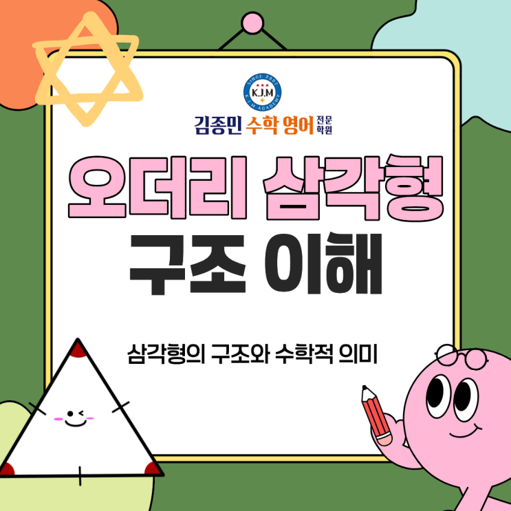 안녕하세요. 천안 신방동 김종민 수학영어전문학원입니다. 공부는 쌓이는 속도가 일정하지 않습니다. 같은 시간을 들여도 이해의 깊이는 다르고, 그 차이는 결국 어떻게 공부했는가에서 만들어집니다. 수학에서 흥미를 느끼는 순간은 공식이 아니라 구조를 이해할 때 찾아옵니다. 오늘 소개할 오더리 삼각형은 복잡한 계산 없이도, 도형이 가진 질서와 아름 다움을 직접 느낄 수 있는 특별한 입체 도형입니다. 초등과 중등 도형 학습에서 한 단계 더 확장된 사고를 경험할 수 있는 좋은 소재이기도 합니다. 1. 오더리 삼각형이란 무엇인가 오더리 삼각형은 ‘잘 정돈된 삼각형’이라는 의미를 가진 입체 도형입니다. 정삼각형 4개를 고리 모양으....... <img src="https://blogthumb.pstatic.net/MjAyNjAxMzBfMTA0/MDAxNzY5NzYyMDQ4MDcw.47Oqgi-4PX6Tr5LPHPDRkx2I5i3QIW0J8MP_W3PEY0Ag.ih1w3k2qs5Y4ibX2LsC2gMCsRUHOVLIGWkspu0PzWNEg.PNG/%BF%C0%B4%F5%B8%AE_%BB%EF%B0%A2%C7%FC__-_1.png?type=s3" />