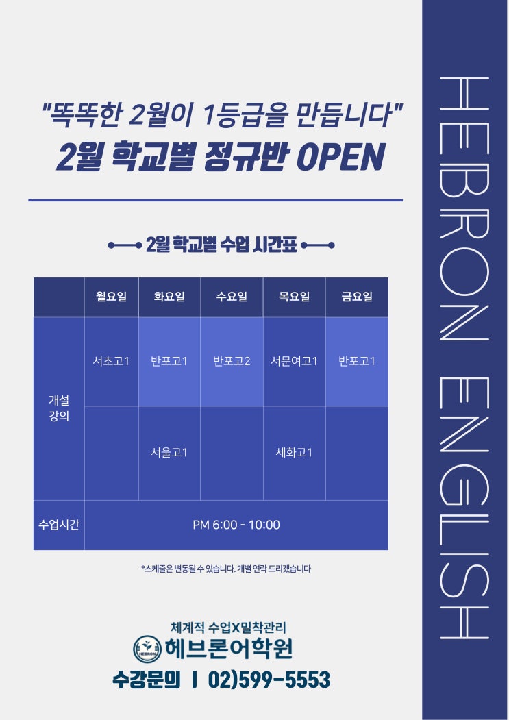 [헤브론어학원]▣고등부 설명회 링크 ▶서울고 https://youtu.be/PpizregEerA ▶서초고 https://youtu.be/K3sk4rI3QKA ▶서문여고 https://youtu.be/5DRq_xrzueg ▶반포고 https://www.youtube.com/watch?v=WTFzh8tN5sQ ▣ 고등학교별 내신개강: 2월 2일 (주1회) ▶서초, 세화, 서울, 서문여고, 반포(1,2학년)◀ ▣ 고등학교 입학 전 마지막 골든타임 ▶7주문법완성 개강: 2월7일 (주1회, 매주 토요일) 신청 및 문의: 헤브론어학원 02-599-5553 감사합니다. <img src="https://blogthumb.pstatic.net/MjAyNjAxMzFfMTY1/MDAxNzY5ODU4NTc0OTE0.GE4cZIFoG4jp8iHCL_iF9ps62GFnvN9HW32c0w2Nvawg.HlhpYPtD0X7siO6HMCeKv4Hpnr6MpW_vSmCUWBQZpNQg.JPEG/26%B3%E2%B0%ED%B5%EE%B3%BB%BD%C5%BD%C3%B0%A3%C7%A5.jpg?type=s3" />