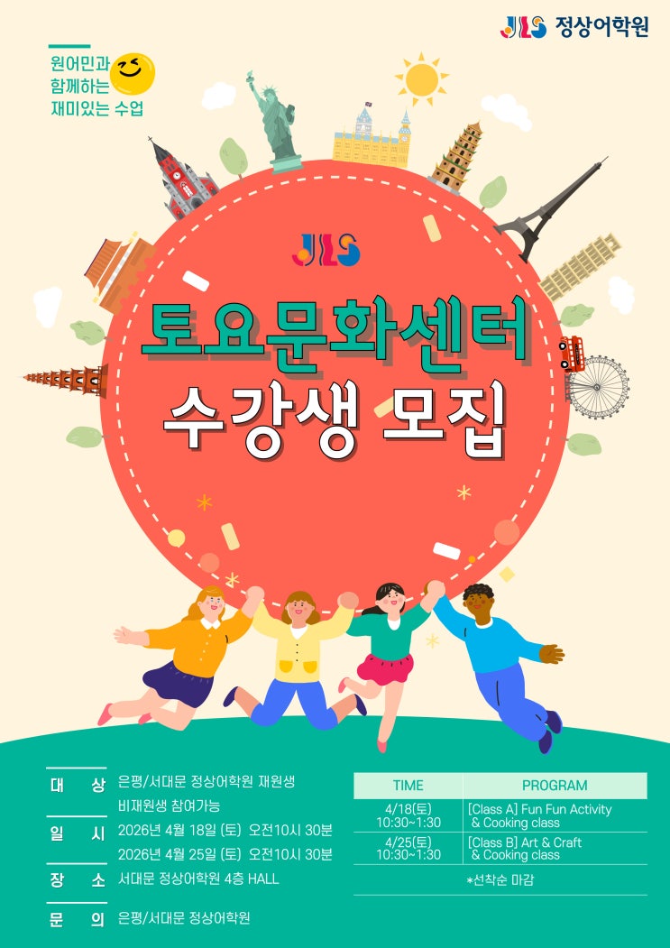 [2026년 정상어학원 JLS 문화 센터 개원] 안녕하세요, 서대문 / 은평 정상어학원입니다! 유달리 추웠던 겨울이 지나고, 드디어 새로운 학기 시작과 함께 따스한 봄이 찾아왔습니다. 지난 두 학기 동안 원어민 선생님과 함께한 Art & Craft 수업에 보내주신 학생들과 학부모님들의 뜨거운 성원에 힘입어, 다가오는 4월부터 정식으로 '정상어학원 문화센터'를 개원하게 되었습니다! 아이들이 토요일을 손꼽아 기다릴 수 있도록 알차게 준비한 토요 수업 프로그램을 안내드립니다. 아래링크로 신청 부탁드립니다^^ https://docs.google.com/forms/d/1Yw-pSy2Re6DkJSwQ2_o6xW1jlwJ6amWWrPPQZIV-Phk/edit 2026년 정....... <img src="https://blogthumb.pstatic.net/MjAyNjAzMjdfMjM2/MDAxNzc0NjA0MTUzNzQ3.A57sBCOnvl5BMYjuvroZlvqnzlEeXKygksR4jvgz4Swg.b_40VsezSpbfn5wjUbmW4roSwjbpc2isnWojIIEaedMg.JPEG/KakaoTalk_20260326_175931684_01.jpg?type=s3" />