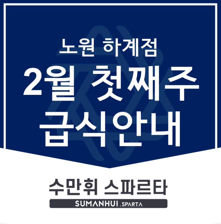 안녕하세요:) 수만휘 스파르타노원점입니다. 2월 첫째주 급식 안내입니다. 메뉴 참고해서 점심, 저녁 신청 부탁드립니다. 궁금한점 있으면 언제든지 문의주세요~ <img src="https://blogthumb.pstatic.net/MjAyNjAyMDFfMTQ3/MDAxNzY5OTAyNTU3OTMw.3UdNY-UzDIcgEZzGUTAvJtEmd0mzaz6mwr-m1f4N9V8g.LH0tKlhqWH_iyWL_LfEQyDJBCH0uWF6544RPvtKlSmwg.PNG/image.png?type=s3" />