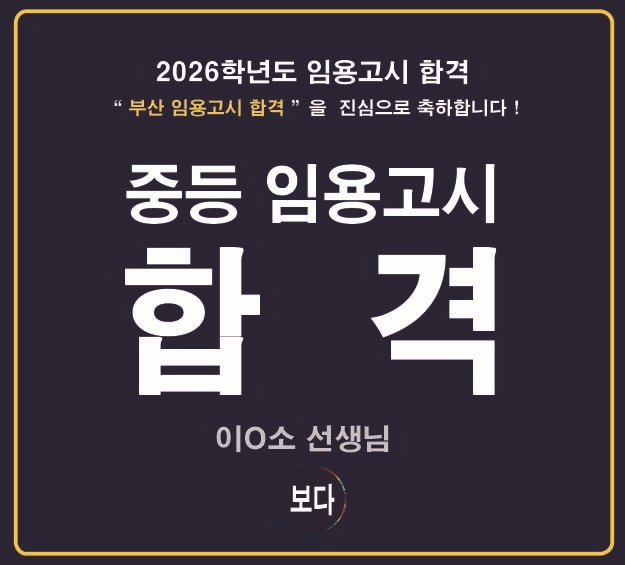 #2026학년도 #부산 #중등임용고시합격 을 축하합니다! 안녕하세요 보다미술학원 입니다 2026학년도 중등 임용고시에 저희 보다미술학원에서 1명 지원 1명 합격 100% 합격의 쾌거를 이루었습니다 2024, 2025, 2026학년도 3년 연속 중등 임용고시 합격을 축하합니다! <img src="https://blogthumb.pstatic.net/MjAyNjAyMDVfMjYz/MDAxNzcwMjY4MTAxMTY1.ub8kFcuZQv6DbZWVihl6Qu8r19pZ6EdUY7p0yzJevCAg.dhxrZd2ktFJwxKJ-Ezfg3Ch8tdZFN-2q3B44dQA1Z6Ig.JPEG/%C0%D3%BF%EB%B0%ED%BD%C3_%C0%CC%B9%CC%BC%D2-%C0%CE%BD%BA%C5%B8_copy.jpg?type=s3" />